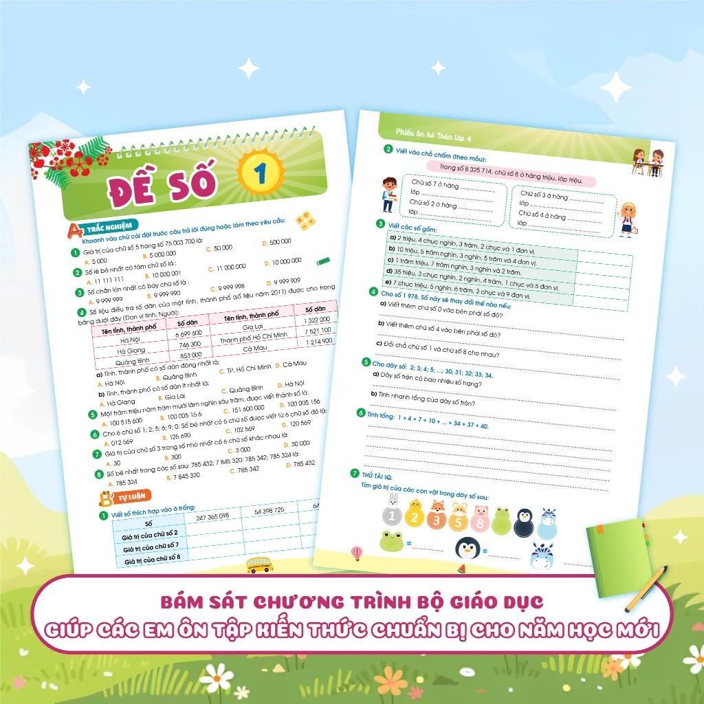 - Bám sát chương trình giảng dạy: bo Phiếu ôn hè Toán, Tiếng Việt và Tiếng Anh lớp 4 được biên soạn dựa trên chương trình của Bộ Giáo dục và Đào tạo (GD&ĐT). Điều này đảm bảo rằng các em học sinh có thể ôn tập và củng cố kiến thức một cách hiệu quả, chuẩn bị tốt nhất cho năm học mới.