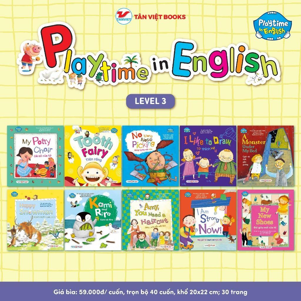 Thông qua mỗi câu chuyện ý nghĩa đó, các tác giả gửi gắm những bài học thiết thực, những lời khuyên hữu ích, cùng vô vàn kỹ năng sống mà các độc giả nhỏ cần. Playtime in English là một bộ sách song ngữ Anh - Việt thú vị, có tính ứng dụng cao. Bộ sách bao gồm 40 cuốn, được chia thành 4 cấp độ được nâng cấp cả về bài học lẫn cấu trúc câu. Mỗi cuốn sách trong bộ là một câu chuyện xoay quanh cuộc sống một ngày của một hoặc nhiều bạn nhỏ.