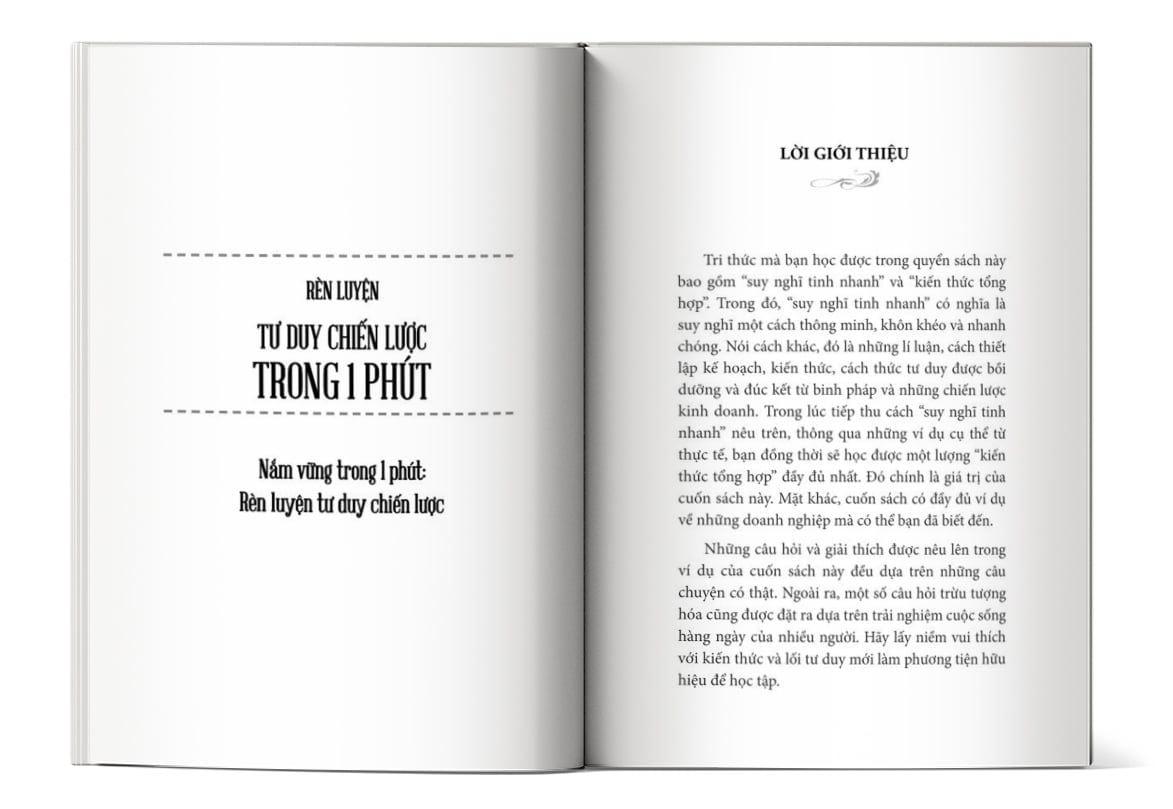 Rèn Luyện Tư Duy Chiến Lược 1 Phút “Rèn Luyện Tư Duy Chiến Lược 1 Phút” là cuốn sách thực chiến giúp bạn phát triển khả năng suy nghĩ có hệ thống, đưa ra quyết định nhanh, chính xác và hiệu quả trong công việc lẫn cuộc sống. Trong một thế giới nơi thời gian là tài nguyên quý giá, người chiến thắng không phải là người làm nhiều hơn, mà là người nghĩ đúng hơn trong thời gian ngắn hơn. Cuốn sách “Rèn Luyện Tư Duy Chiến Lược 1 Phút” chính là công cụ giúp bạn rèn luyện kỹ năng đó – suy nghĩ nhanh, sâu, đúng trọng tâm chỉ trong 60 giây. Với lối viết cô đọng, thực tế và giàu tính ứng dụng, cuốn sách mang đến một lối tư duy mới để bạn ra quyết định chính xác hơn trong công việc, học tập và cuộc sống cá nhân. Nội dung chính của cuốn sách Rèn Luyện Tư Duy Chiến Lược 1 Phút Cuốn sách được chia thành nhiều phần nhỏ, mỗi phần là một nguyên lý hoặc bài học chiến lược ngắn gọn, dễ áp dụng. Cuốn sách bao gồm 6 chương chính: