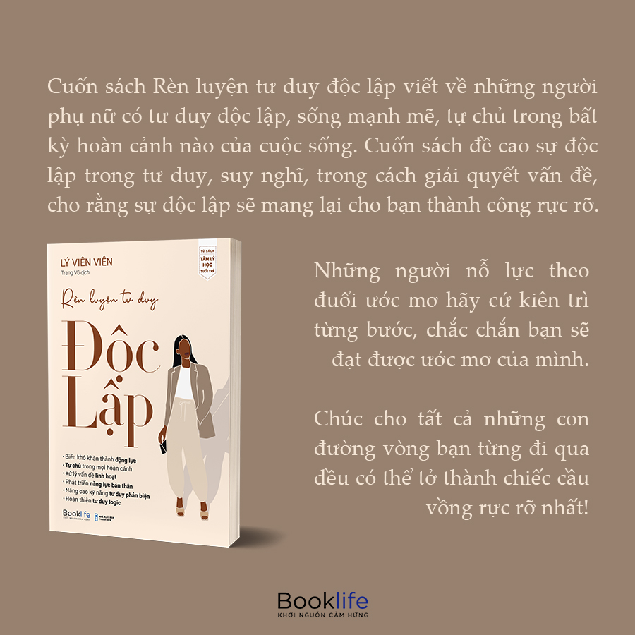 Cuốn sách Rèn luyện tư duy độc lập viết về những người phụ nữ có tư duy độc lập, sống mạnh mẽ, tự chủ trong bất kỳ hoàn cảnh nào của cuộc sống. Cuốn sách đề cao sự độc lập trong tư duy, suy nghĩ, trong cách giải quyết vấn đề, cho rằng sự độc lập sẽ mang lại cho bạn thành công rực rỡ. Những người nỗ lực theo đuổi ước mơ hãy cứ kiên trì từng bước, chắc chắn bạn sẽ đạt được ước mơ của mình. Chúc cho tất cả những con đường vòng bạn từng đi qua đều có thể tở thành chiếc cầu vồng rực rỡ nhất!
