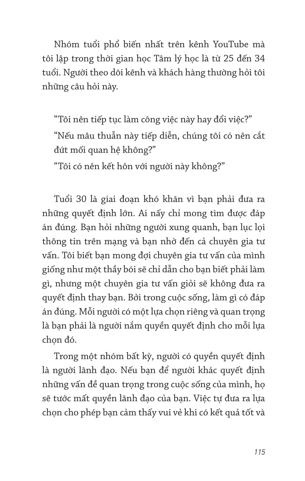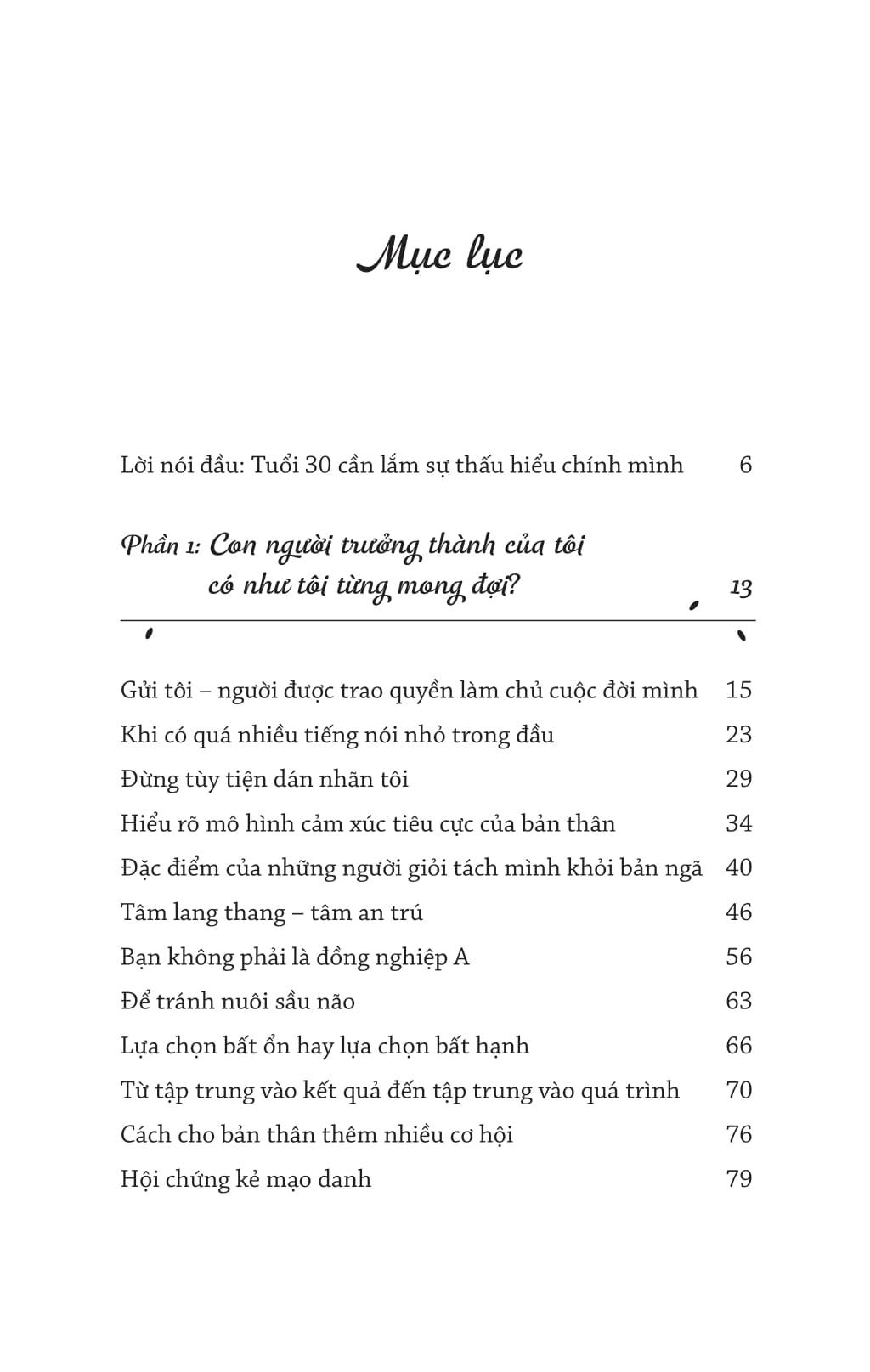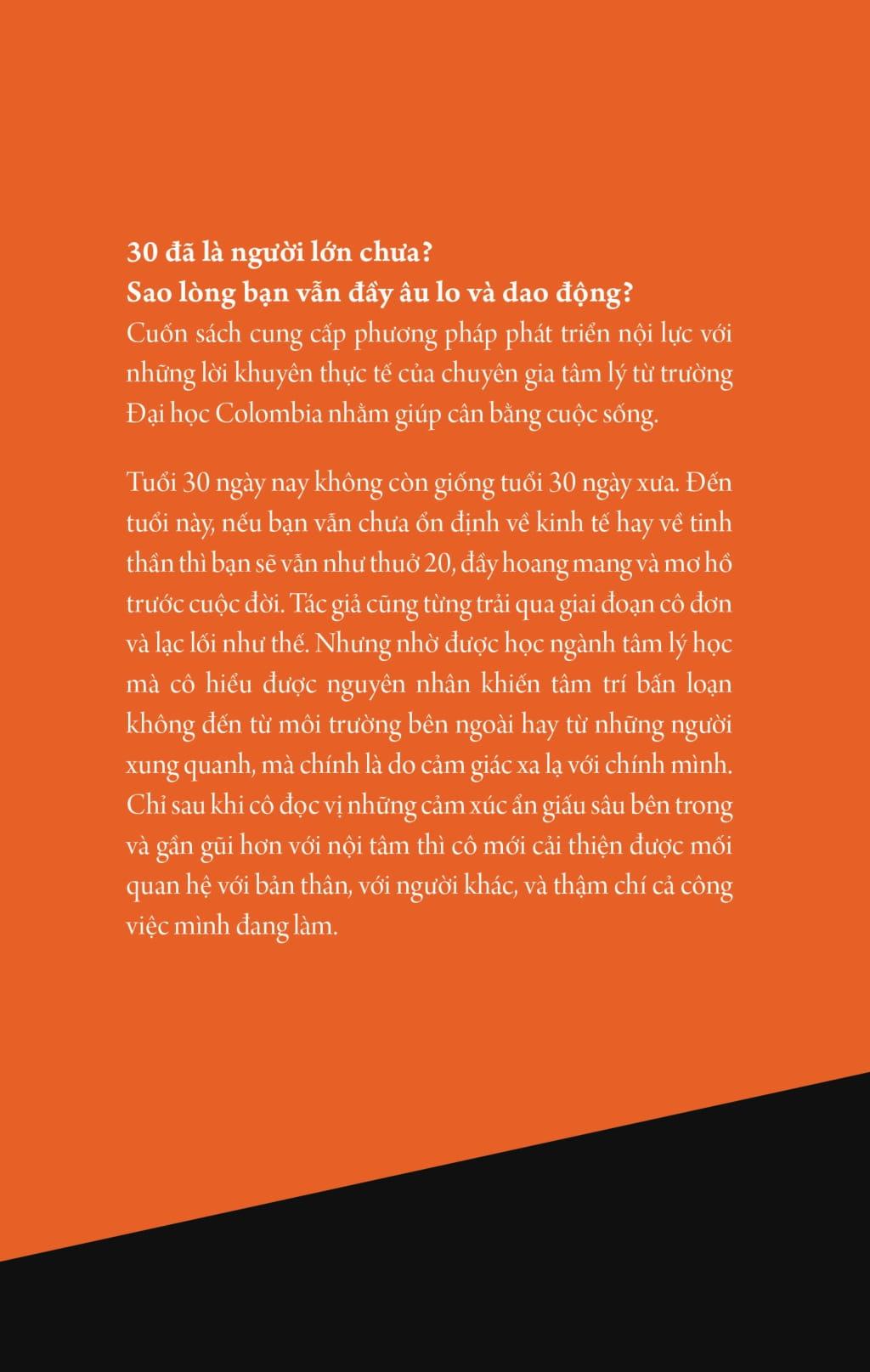Tuổi 30 ngày nay không còn giống tuổi 30 ngày xưa. Đến tuổi này, nếu bạn vẫn chưa ổn định về kinh tế hay về tinh thần thì bạn sẽ vẫn như thuở 20, đầy hoang mang và mơ hồ trước cuộc đời. Tác giả cũng từng trải qua giai đoạn cô đơn và lạc lối như thế. Nhưng nhờ được học ngành tâm lý học mà cô hiểu được nguyên nhân khiến tâm trí bấn loạn không đến từ môi trường bên ngoài hay từ những người xung quanh, mà chính là do cảm giác xa lạ với chính m.ình. Chỉ sau khi cô đọc vị những cảm xúc ẩn giấu sâu bên trong và gần gũi hơn với nội tâm thì cô mới cải thiện được mối quan hệ với bản thân, với người khác, và thậm chí cả công việc m.ình đang làm.