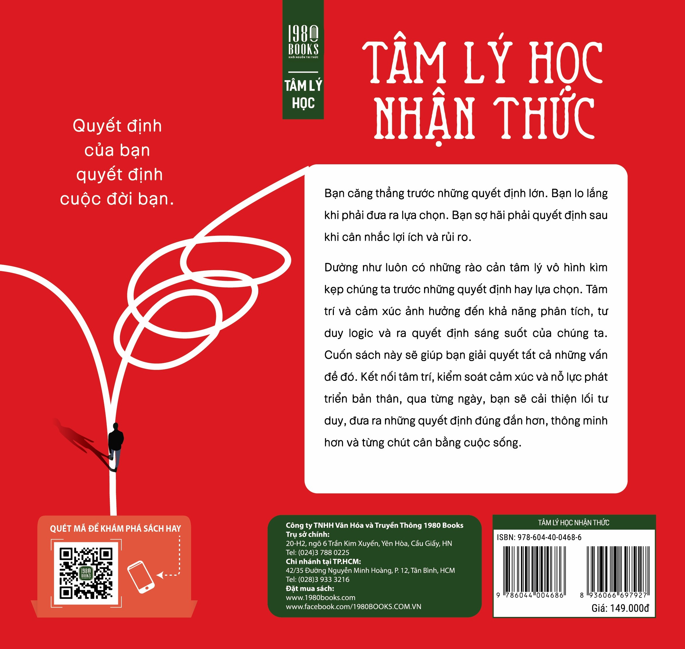 Tác giả: Patrick Edblad Người dịch: Linh Blessin THÔNG TIN XUẤT BẢN: Kích thước khổ: 13x19 Số trang: 244 Giá bìa: 149,000 vnđ Mã EAN: 8936066697927 NXB liên kết: NXB DÂN TRÍ Sách do Công ty TNHH Văn hóa và Truyền thông 1980 BOOKS ấn hành quý I/2024. CÔNG TY TNHH VĂN HÓA VÀ TRUYỀN THÔNG 1980 BOOKS   TÂM LÝ HỌC NHẬN THỨC Bạn căng thẳng trước những quyết định lớn. Bạn lo lắng khi phải đưa ra lựa chọn. Bạn sợ hãi phải quyết định sau khi cân nhắc lợi ích và rủi ro… Dường như luôn có những rào cản tâm lý vô hình kìm kẹp chúng ta trước những quyết định hay lựa chọn. Chúng ta cũng mắc những sai lầm về tư duy cố hữu trong cách nhìn nhận, xử lí và hiểu thông tin xung quanh mình. Những điều này có thể trở thành vấn đề dẫn tới sự phá hủy cảm giác, cách đánh giá không chính xác và các quyết định không hợp lí.   Nguyên nhân của tất cả những vấn đề được kể trên là vì thiếu kỹ năng ra quyết định. Chúng ta thiếu nhận thức về sự tác động của tâm trí và cảm xúc đến khả năng phân tích, tư duy logic và ra quyết định sáng suốt của chúng ta. May mắn là bạn có thể khiến não bộ rèn luyện khả năng tư duy theo phương thức mới hiệu quả hơn, nhận thức các yếu tố tâm lý tác động đến lựa chọn của chúng ta hay những sai lầm trong tư duy thường có. Và trong “Tâm lý học nhận thức”, tác giả sẽ chỉ ra cho bạn thấy phương thức thực hiện một cách chính xác. Kết nối tâm trí, kiểm soát cảm xúc và nỗ lực phát triển bản thân, qua từng ngày, bạn sẽ cải thiện lối tư duy, đưa ra những quyết định đúng đắn hơn, thông minh hơn và từng chút cân bằng cuộc sống.   Cụ thể, trong cuốn sách này chúng ta sẽ đào sâu tìm hiểu tất cả các yếu tố tâm lý học ảnh hưởng đến khả năng ra quyết định và lựa chọn của chúng ta, bao gồm: • CÁC THIÊN HƯỚNG NHẬN THỨC, bao trùm tất cả các sai lầm về tâm lý phá hủy lối tư duy của bạn, từ thiên hướng khẳng định, thiên hướng tự đề cao bản thân đến hiệu ứng ám ảnh về sự mất mát hay hiệu ứng Dunning-Kruger và thiên hướng điểm mù. • CÁC LỖI NGỤY BIỆN, từ các lỗi khiến cách đánh giá trở nên lệch lạc, lỗi khái quát hóa vội vàng, lầm tưởng nhân quả đến xu hướng chạy theo đám đông hay ngụy biện trong ngụy biện. • Và cuối cùng là NHỮNG KIỂU MẪU VỀ TÂM LÍ, bao gồm các công cụ tư duy, hệ thống 1 và 2, Bản đồ không phải là lãnh thổ, Quy luật 80/20 hay nhiều mô hình hay kiểu mẫu tư duy khác. Đến cuối cuốn sách này, bạn sẽ trang bị được một nền tảng vững chắc về tâm lý học nhận thức, tư duy hợp lí, khoa học và hiệu quả. Kết quả là bạn sẽ ra những quyết định sáng suốt hơn và đạt được những kết quả tốt đẹp hơn. Mọi thứ trong cuốn sách đều được giải thích theo cách đơn giản và rõ ràng. Tác giả sẽ hướng dẫn bạn từng bước một và việc bạn cần làm là đi theo, tiếp thu và vận dụng các ý tưởng vào lối tư duy của riêng bạn.