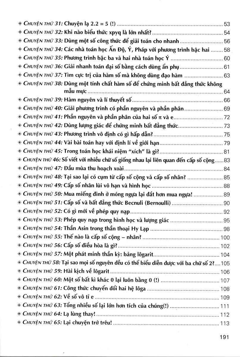 - Giải trí sau những giờ phút làm việc, học tập. Cuốn sách này gồm hai tập, mỗi tập gồm 101 chuyện lí thú về toán: tập một dành cho các bạn có trình độ THCS, tập hai dành cho các bạn có trình độ THPT. Với mỗi chuyện trong sách, mong các bạn suy nghĩ, làm thử, giải đáp thử trước khi đọc tiếp. Hi vọng cuốn sách này góp phần tạo cho các bạn lòng say mê toán học, môn thể dục của trí tuệ.