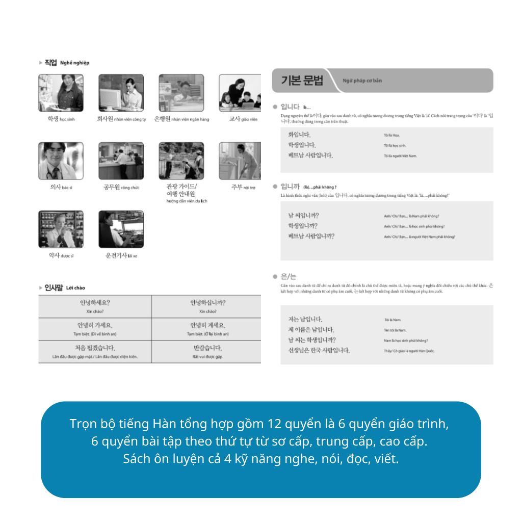 Giáo trình tiếng Hàn tổng hợp sơ cấp dành cho người học tiếng Hàn trình độ sơ cấp gồm 2 cuốn: 1 và 2. Sau khi hoàn thành các bài học ở cuốn Giáo trình