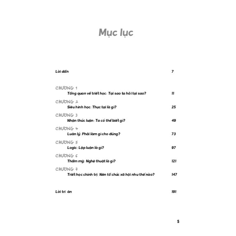 Đây là một cuốn sách sâu sắc và thú vị, giúp bạn đọc khám phá triết học thông qua các câu hỏi kích thích tư duy. Sách chia ra nhiều phần nhỏ, đi từ lý luận đến thực tiễn, để độc giả có thể học các khái niệm triết học cốt lõi và củng cố kỹ năng tư duy phản biện của mình. Các kiến thức được trình bày đơn giản, súc tích thông qua những câu hỏi thú vị, như: Liệu có thể chứng minh sự tồn tại của Chúa? Tâm trí thật ra là cái gì? Làm thế nào chúng ta có thể chắc chắn về bất cứ điều gì?