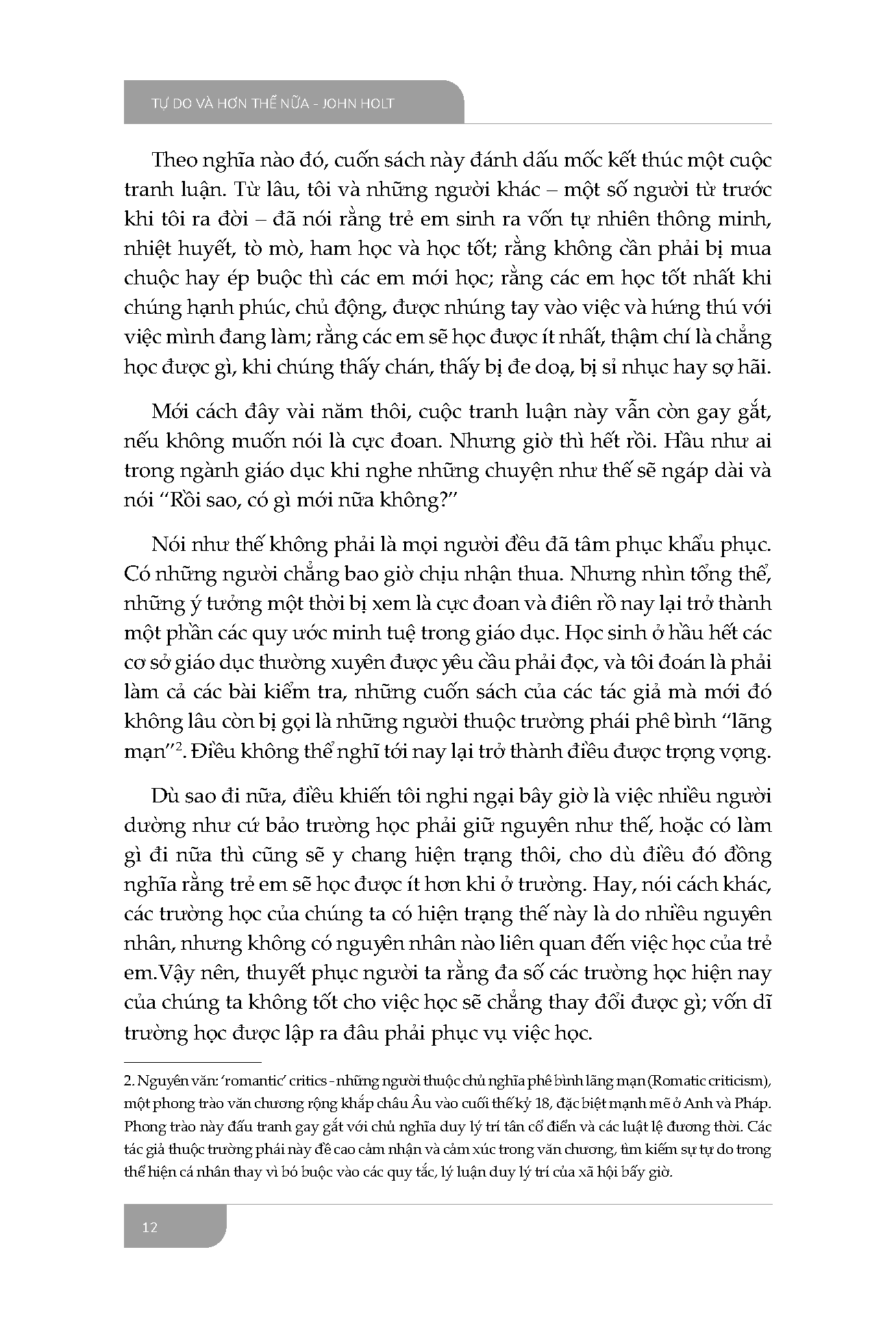 Đây là cuốn sách dành cho những ai không chỉ hoài nghi, mà còn muốn tìm đường ra khỏi mê cung mang tên “giáo dục bắt buộc”. Mang trong m.ình một sự thấu hiểu sâu sắc đối với tâm lý người học – những con người nhỏ bé đang ngày ngày chịu đựng những hệ thống “vì trẻ em” nhưng lại chẳng hiểu gì về nhu cầu thực sự của trẻ, Tự Do và Hơn Thế Nữa là một bản tổng phổ tư tưởng của John Holt – và là lời nhắc nhở rằng: tự do, nếu không đi xa hơn lời nói, sẽ chỉ là một ảo ảnh.