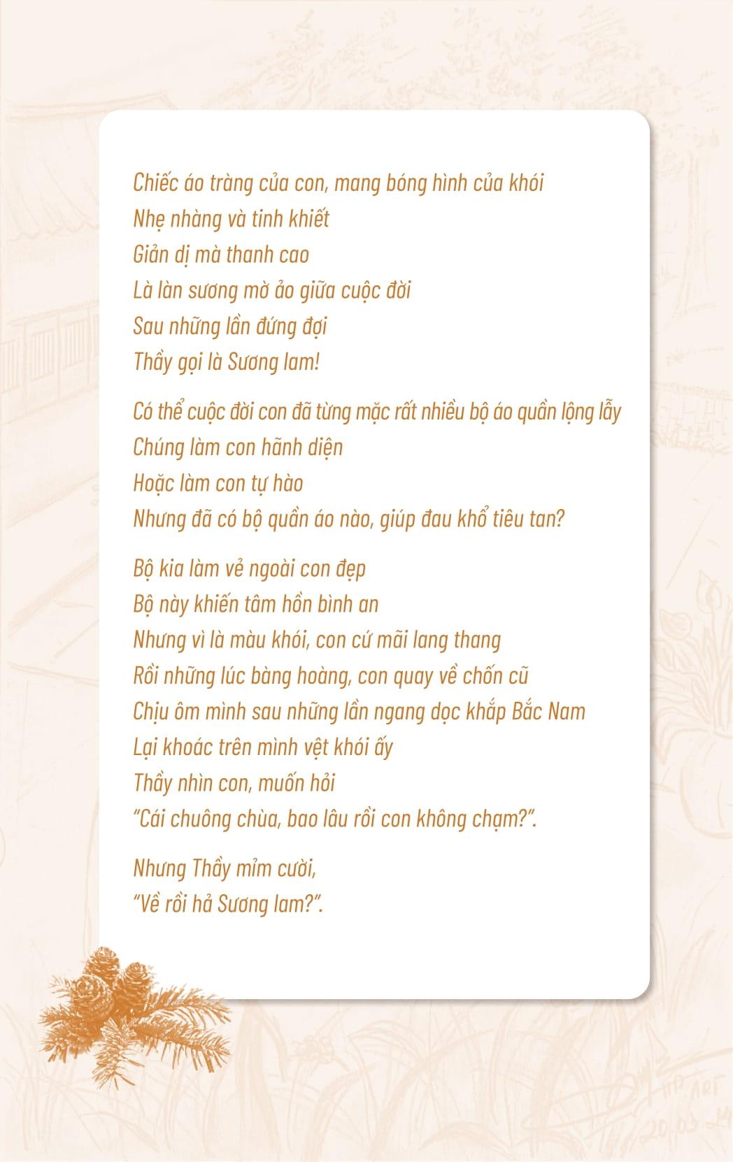 Tác giả muốn nói với các bạn rằng, vẫn còn một nơi thật sự bình yên luôn chờ đón các bạn trở về, vẫn có những con người thầm lặng mang trong m.ình một trái tim bao dung luôn dịu dàng che chở. Có thể là gia đình, người thân có thể bạn bè, và cũng có thể là những vị Thầy đang ẩn m.ình đâu đó trong những ngôi chùa mà các bạn vô tình bắt gặp trên hành trình vạn dặm.