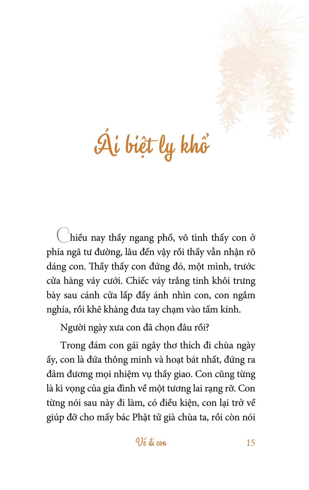 Quyển sách Về đi con - Nghe êm đềm đâu đó mộng đoàn viên của tác giả Mộc Trầm (Thích Đạo Quang) chính là những sợi chỉ kết tinh từ hạnh phúc, để bạn khâu vá lại mảng trống rỗng nơi tâm hồn và thêu những bông hoa của lòng yêu thương và cảm thông vào vườn tâm của ta.