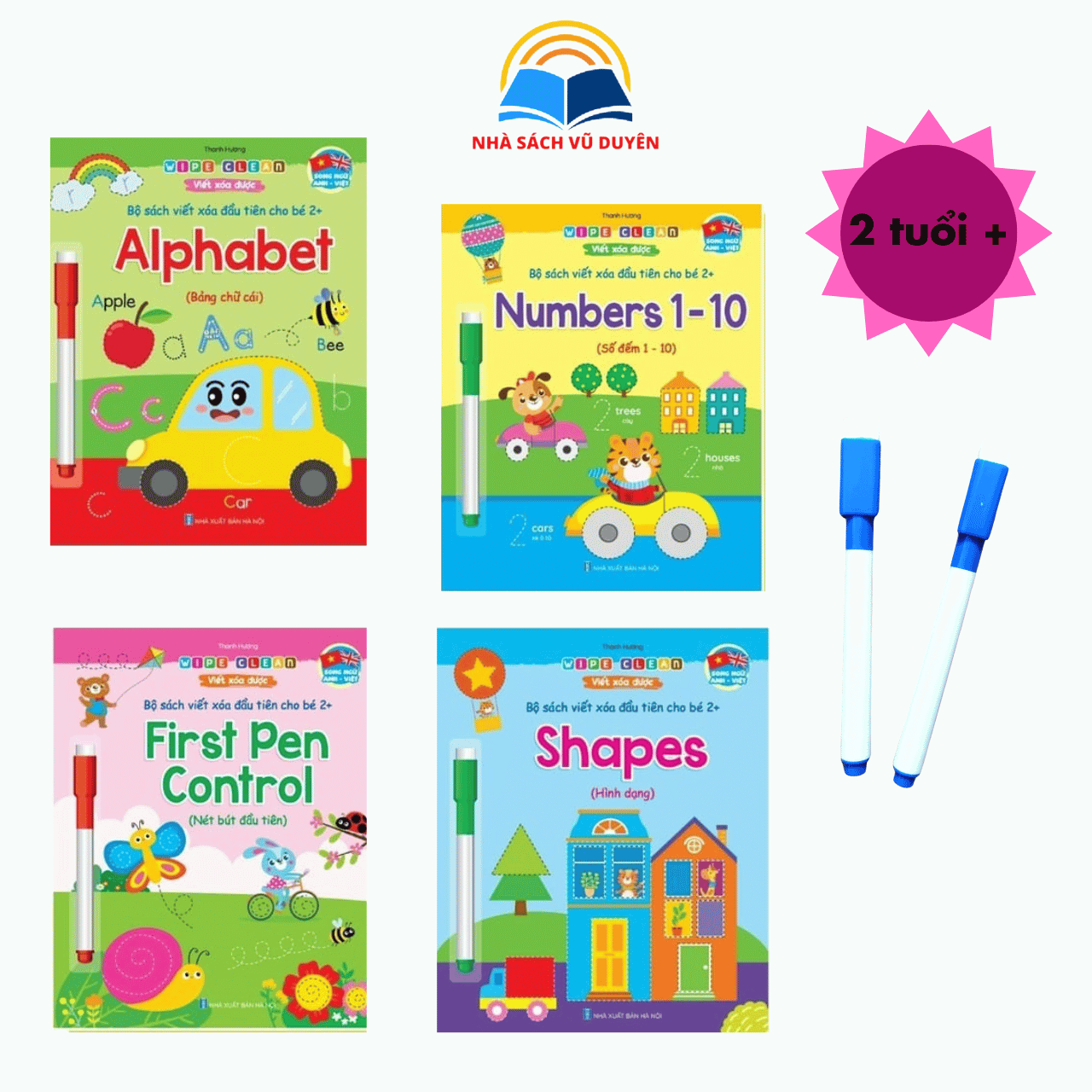 - Bộ sách được thiết kế dành cho các bé từ 2-3 tuổi trở lên luyện kĩ năng cầm bút viết, vẽ theo các nét cơ bản, hình dạng, chữ cái, chữ số và mở rộng vốn từ vựng tiếng Anh. Các hình ảnh được minh họa ngộ nghĩnh, đáng yêu với màu sắc sống động sẽ thu hút các bé ngay từ cái nhìn đầu tiên khi lật mở từng trang sách. Trọn bộ gồm 4 quyển: • First Pen Control (Nét bút đầu tiên) • Alphabet (Bảng chữ cái tiếng Anh) • Numbers 1-10 (Số đếm 1-10) • Shapes (Hình dạng) Bộ sách được cán màng bóng đặc biệt giúp các bé có thể vừa học vừa chơi, viết xóa được nhiều lần khi dùng bút dạ viết bảng trắng, tiết kiệm chi phí, bền đẹp, chịu nước và dễ lau chùi bụi bẩn, không xé rách được. Mỗi quyển gồm 18 trang, khổ to 19x23 cm. NXB Hà Nội. Giá trọn bộ 4 quyển: 180.000₫/bộ (Tặng kèm 2 bút viết xóa được)