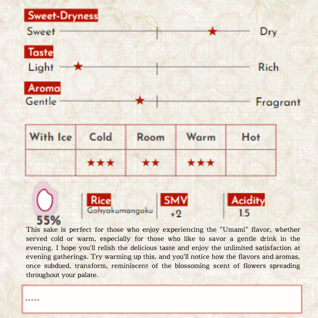 Loại r'ượu sake này hoàn hảo cho những ai thích trải nghiệm hương vị "Umami", dù dùng lạnh hay ấm, đặc biệt dành cho những ai thích thưởng thức đồ uống nhẹ nhàng vào buổi tối. Với Iwao 60 hy vọng bạn sẽ thưởng thức được hương vị thơm ngon và tận hưởng sự thỏa mãn không giới hạn trong những buổi họp mặt buổi tối.