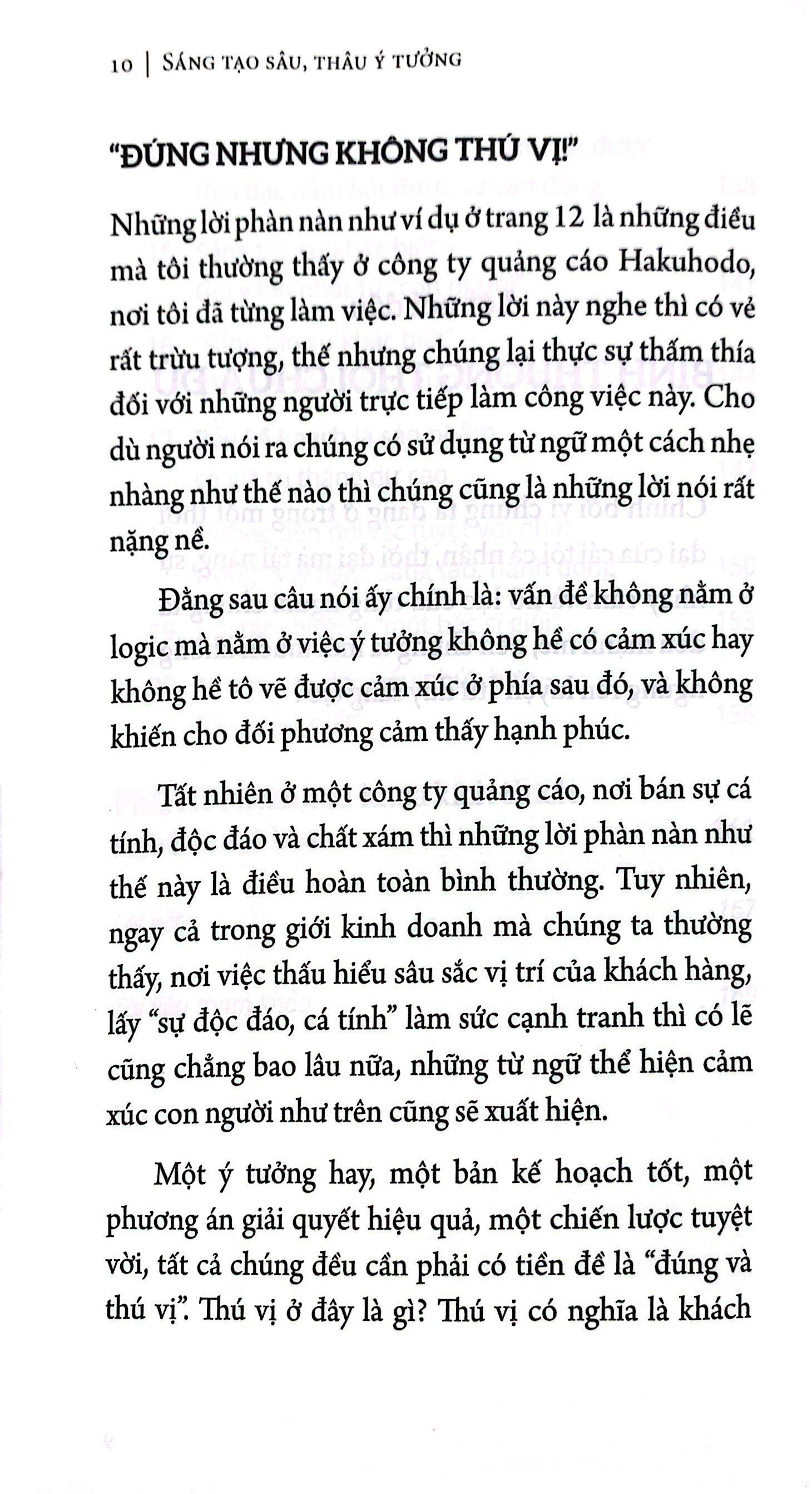 - Người làm việc kiểu phức hợp – “Nhà sản xuất” Phần 3. Những từ khóa kích thích nghệ thuật hóa Lời kết Tài liệu tham khảo Trích đoạn sách: Đúng nhưng không thú vị! Những lời phàn nàn như ví dụ ở trang 12 là những điều mà tôi thường thấy ở công ty quảng cáo Hakuhodo, nơi tôi đã từng làm việc. Những lời này nghe thì có vẻ rất trừu tượng, thế nhưng chúng lại thực sự thấm thía đối với những người trực tiếp làm công việc này. Cho dù người nói ra chúng có sử dụng từ ngữ một cách nhẹ nhàng như thế nào thì chúng cũng là những lời nói rất nặng nề. Đằng sau câu nói ấy chính là: vấn đề không nằm ở logic mà nằm ở việc ý tưởng không hề có cảm xúc hay không hề tô vẽ được cảm xúc ở phía sau đó, và không khiến cho đối phương cảm thấy hạnh phúc. Tất nhiên ở một công ty quảng cáo, nơi bán sự cá tính, độc đáo và chất xám thì những lời phàn nàn như thế này là điều hoàn toàn bình thường. Tuy nhiên, ngay cả trong giới kinh doanh mà chúng ta thường thấy, nơi việc thấu hiểu sâu sắc vị trí của khách hàng, lấy “sự độc đáo, cá tính” làm sức cạnh tranh thì có lẽ cũng chẳng bao lâu nữa, những từ ngữ thể hiện cảm xúc con người như trên cũng sẽ xuất hiện. Một ý tưởng hay, một bản kế hoạch tốt, một phương án giải quyết hiệu quả, một chiến lược tuyệt vời, tất cả chúng đều cần phải có tiền đề là “đúng và thú vị”. Thú vị ở đây là gì? Thú vị có nghĩa là khách hàng nhìn vào thấy được sự độc đáo, hấp dẫn và có khả năng lôi cuốn người khác. Từ khóa cho nó chính là những ý tưởng “có tính nghệ thuật”. Nghệ thuật chính là chiến lược cao cấp trong “xã hội dư thừa vật chất” đương đại Cũng tốt nhưng chúng tôi không thích! Cho dù sản phẩm có trình độ kỹ thuật cao, tính năng tốt đi chăng nữa nhưng một khi khách hàng nói “Tôi không thích” thì đó cũng là dấu chấm hết, những đồ vật hay hàng hóa ấy sẽ dần bị loại bỏ. Đó cũng chính là nỗi kinh hoàng của “xã hội dư thừa vật chất”. “Chất lượng cao” là điều hiển nhiên. Thêm vào đó, việc bản thân ý tưởng có mang lại sự đồng cảm, niềm hạnh phúc và yêu thích hay không cũng là một vấn đề cần quan tâm. Nếu chúng ta được nhận xét giống như ở trang bên, điều đó có nghĩa chúng ta chưa chạm tới được trái tim của khách hàng. Yêu ghét là cảm tính. Người ta vẫn nói rằng con người hành động chỉ có 20% là theo logic, còn lại 80% là phi logic. Và như vậy, một công việc kinh doanh không đánh vào cảm xúc của con người, không chạm tới cảm tính của con người sẽ bị tụt lại phía sau. Thời đại ngày nay càng ngày càng không thể tách biệt với tính nghệ thuật.