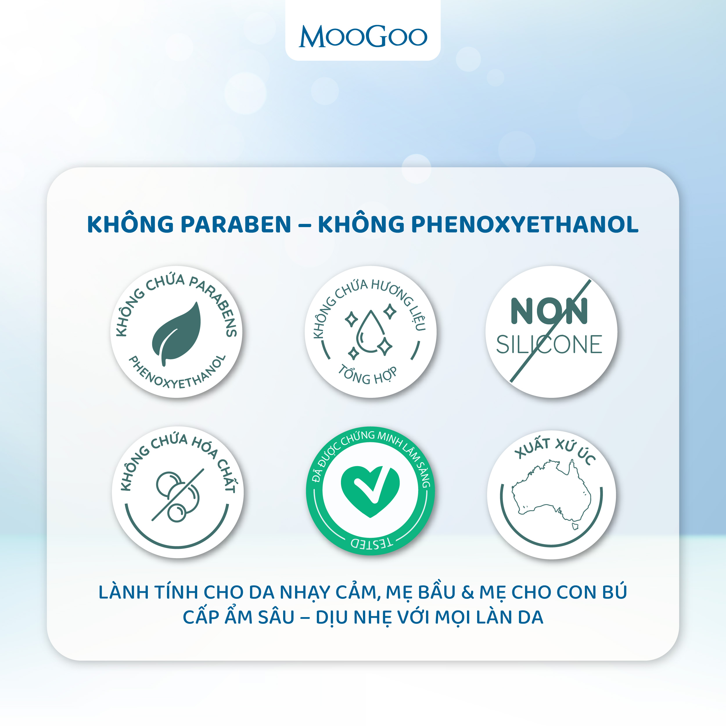 Công Dụng Chính:  Hyaluronic Acid giữ nước tối ưu, giúp da căng mọng, giảm nếp nhăn.  Niacinamide (Vitamin B3) kiểm soát dầu thừa, giảm nguy cơ hình thành mụn.  Làm đều màu, giảm đỏ và tăng độ mịn màng cho da.  Chống oxy hóa, ngăn ngừa lão hóa sớm và tổn thương từ gốc tự do. Thành Phần Chính:  Hyaluronic Acid: 2 loại trọng lượng phân tử để cấp ẩm cả bề mặt và sâu bên trong da, tăng độ đàn hồi, giảm khô ráp, giúp da mềm mại.  Niacinamide (Vitamin B3): Kiểm soát dầu, giảm mụn và cải thiện hàng rào bảo vệ da, làm mờ thâm sạm, giảm kích ứng và đều màu da.  Shea Butter & Jojoba Oil: Dưỡng ẩm tự nhiên, tăng cường hàng rào bảo vệ da.  Phospholipids & Glycolipids: Tái tạo da, làm dịu da nhạy cảm và kích ứng. Tinh Dầu Oatmeal: Mùi hương dịu nhẹ, không gây kích ứng, phù hợp với da nhạy cảm. Hướng Dẫn Sử Dụng: Làm sạch: Rửa mặt sạch sẽ và lau khô. Thoa serum: Lấy 2-3 giọt serum, thoa đều lên mặt và cổ, tránh vùng mắt trực tiếp. Dưỡng ẩm: Sử dụng kem dưỡng để khóa ẩm và tăng hiệu quả. Tần suất: Dùng 1-2 lần/ngày (sáng và tối) để đạt kết quả tốt nhất. Phù Hợp Với: Mọi loại da, đặc biệt là da khô, da xỉn màu hoặc có nếp nhăn, lành tính, an toàn cho mẹ bầu và mẹ cho con bú bao gồm những người có làn da nhạy cảm hoặc dễ kích ứng. Không chứa Paraben, Phenoxyethanol hoặc hóa chất gây hại. Dịu nhẹ, an toàn và phù hợp với mọi loại da. Công thức tối ưu, hiệu quả lâu dài với các thành phần thiên nhiên. "Đồng Hành Cùng Làn Da Mịn Màng, Sáng Khỏe Với Hyaluronic Acid Và Niacinamide Từ Thiên Nhiên!"  THÔNG TIN THƯƠNG HIỆU DÒNG MỸ PHẨM ĐẦU TIÊN AN TOÀN ĐẾN MỨC CÓ THỂ ĂN ĐƯỢC MooGoo là sản phẩm mỹ phẩm thiên nhiên nội địa được người dân Úc yêu thiên nhiên, tin dùng và Moogoo cũng nhận được sự yêu thích và tin yêu của các khách hàng yêu các sản phẩm Vegan tại Anh và Mỹ. MooGoo được xem là tinh hoa từ thiên nhiên nước Úc với gần 20 năm sản xuất và phân phối hơn 40 sản phẩm giúp giải quyết nhiều vấn đề ở các loại da cho mọi lứa tuổi.