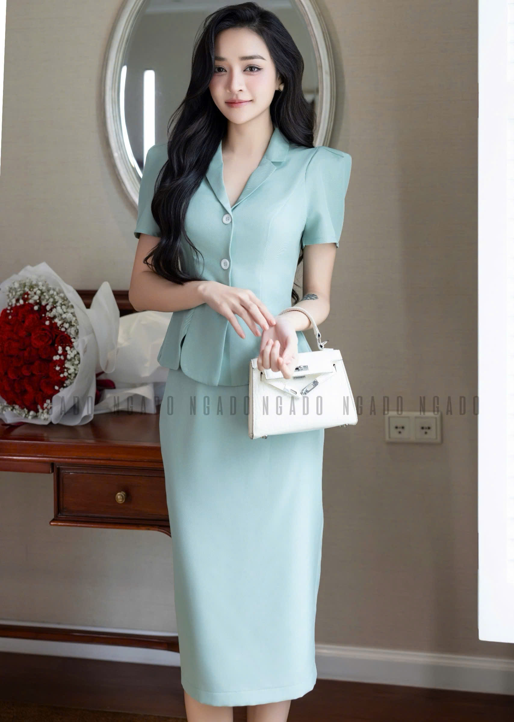 ✨Set áo váy xanh mint bút chì NGADO , set áo váy dài , set công sở