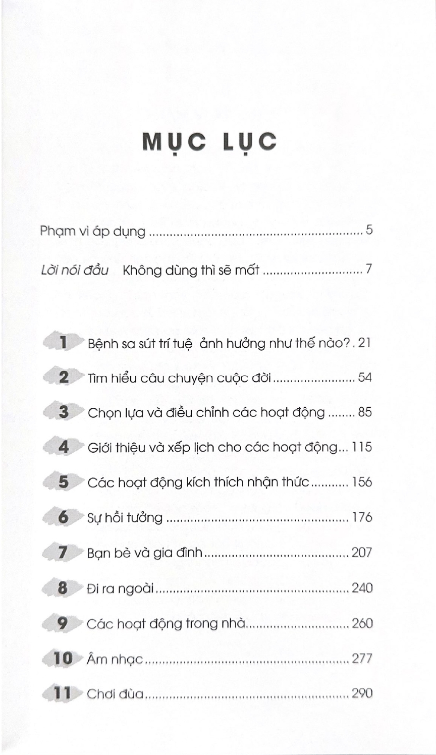 Sống An Nhiên Với Chứng Sa Sút Trí Tuệ Tuổi Già Chúng ta luyện tập các cơ để cơ thể khỏe mạnh, mềm dẻo và làm việc tốt hơn. Tương tự, chúng ta cũng cần luyện tập các cơ đầu óc để giữ cho bộ não mạnh khỏe, mềm dẻo và hoạt động hiệu quả. Ngoài ra, chúng ta cũng cần luyện tập các “cơ quan hệ” (mạng lưới xã hội và bạn bè). Đây là tất cả những gì mà cuốn sách này muốn đề cập đến – củng cố và duy trì sức mạnh cho các cơ đầu óc và quan hệ của những người mắc chứng sa sút trí tuệ tuổi già mà bạn đang chăm sóc. Hy vọng rằng, với việc thực hiện các hoạt động đem lại niềm vui cho người sa sút trí tuệ, bạn cũng sẽ cảm thấy hạnh phúc, mãn nguyện, và thông qua việc chia sẻ nụ cười cùng những hoạt động, mối quan hệ của hai người sẽ tiếp tục lớn mạnh.