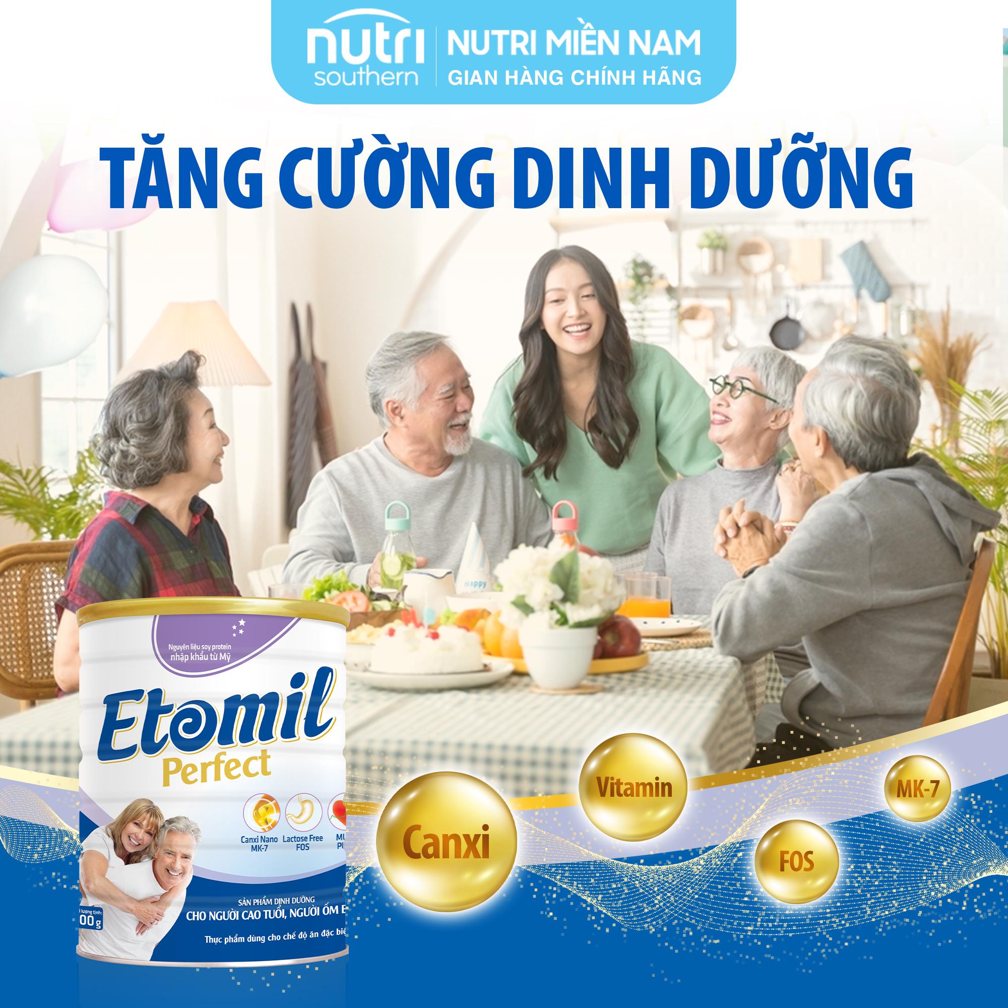 Sữa Cho Người Lớn Tuổi, Người Ốm Bệnh ETOMIL Perfect 900g - Dinh Dưỡng Vàng Cho Người Cao Tuổi, Hương Vị Dễ Uống     THÀNH PHẦN:     CÔNG DỤNG: -Etomil Perfect là sản phẩm dùng để thay thế bữa ăn phụ, giúp bổ sung năng lượng, chất đạm và các vi chất dinh dưỡng, -Etomil Perfect giúp bồi bổ và phục hồi sức khỏe.     ĐỐI TƯỢNG SỬ DỤNG: Người cao tuổi, người ốm bệnh, người cần phục hồi sau phẫu thuật, người gầy yếu, ăn uống kém. Sản phẩm không chứa đường lactose nên có thể dùng cho người bất dung nạp Lactose, người tiêu hóa kém. Người đang hoặc có nguy cơ loãng xương, xốp xương, người đang hoặc có nguy cơ xơ vữa động mạch.     HƯỚNG DẪN SỬ DỤNG: -Pha 5 muỗng gạt (tương đương 48g) với 190ml nước ấm chín được 1 ly khoảng 215ml. -Ngày uống 2-3 ly hoặc theo hướng dẫn của cán bộ y tế.     BẢO QUẢN: Bảo quản nơi khô ráo, sạch sẽ, thoáng mát, tránh ánh nắng trực tiếp. Lon sữa đã mở phải được đóng kín và sử dụng hết trong vòng 3 tuần   XUẤT XỨ: VIỆTNAM HẠN SỬ DỤNG: 36 THÁNG KỂ TỪ NGÀY SẢN XUẤT