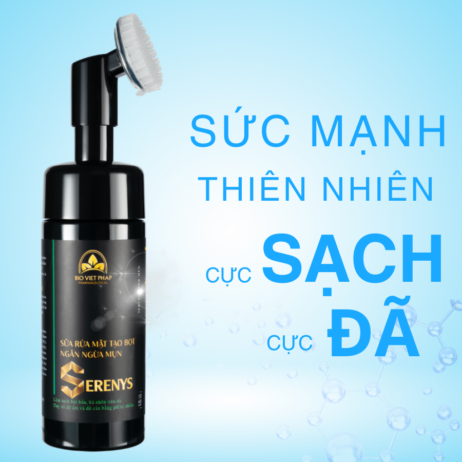 • Bước 3: Rửa sạch lại với nước sạch. Sau đó, lau khô bằng khăn sạch. Nên sử dụng 1-2 lần/ngày để da luôn sạch khỏe, trắng sáng và mịn màng. Lưu ý: Bảo quản sản phẩm ở nơi thoáng mát, tránh ánh nắng mặt trời chiếu trực tiếp vào sản phẩm. Để xa tầm tay trẻ em. CÔNG DỤNG SỮA RỬA MẶT DẠNG BỌT TUYẾT SERENYS Sữa rửa mặt tạo bọt ngăn ngừa mụn Serenys là  hoàn hảo cho nam giới. Giúp:
