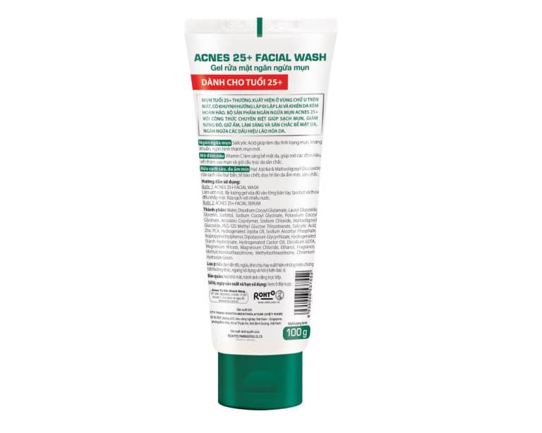 - Acnes 25+ Facial Wash là sữa rửa mặt với độ pH cân bằng, có tác dụng làm sạch da, ngăn ngừa mụn và kháng khuẩn mụn mà không làm khô da. 1.Thành phần và công dụng: