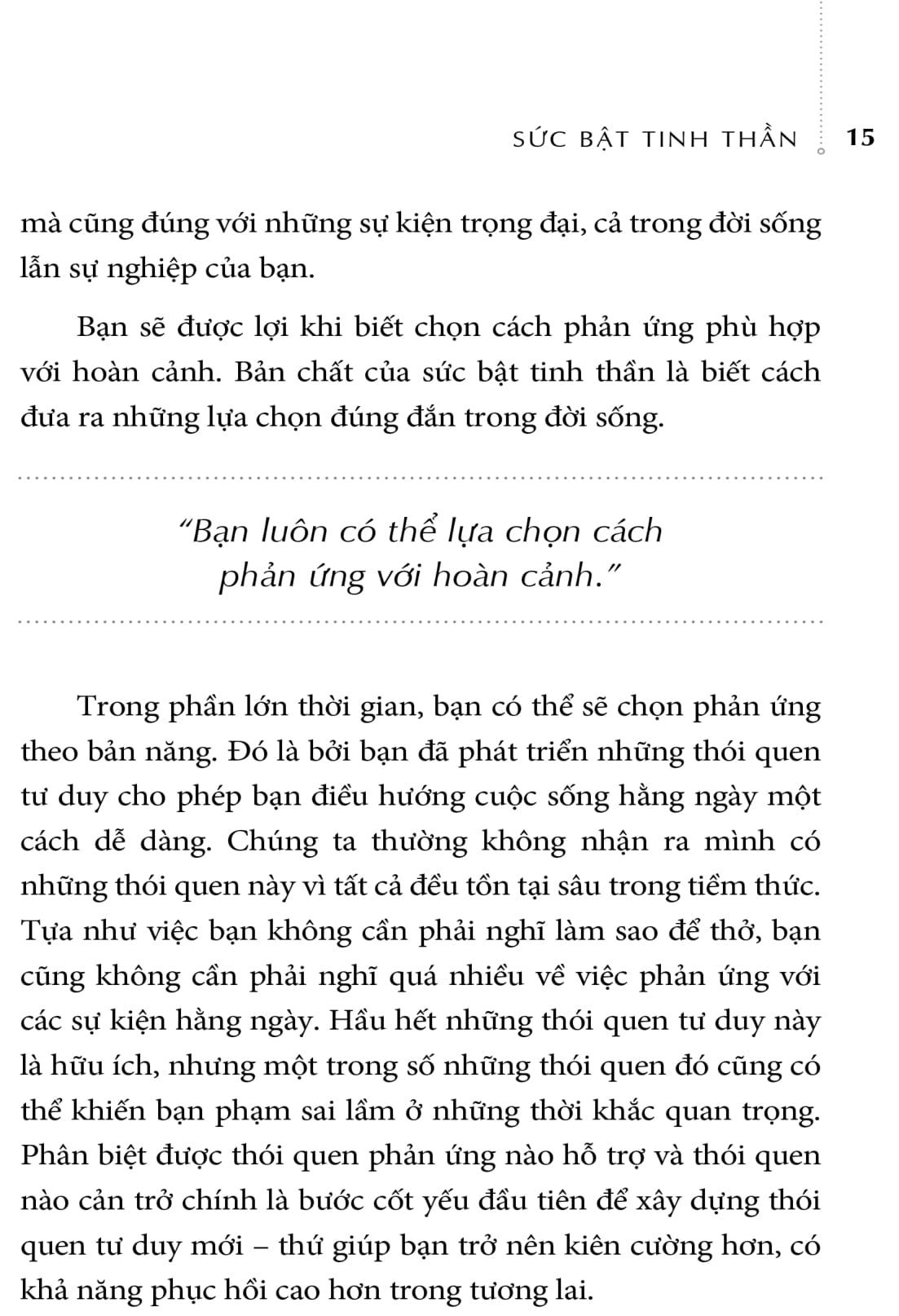 “Sức bật tinh thần” sẽ trình bày 45 kỹ năng và hành động thiết thực giúp bạn có được phẩm chất này một cách dễ dàng và hiệu quả. Và mặc dù được viết dựa trên cơ sở là các nghiên cứu, chúng tôi cũng hướng đến tính thực tiễn cao để bạn có thể chọn cho m.ình hướng đi riêng.