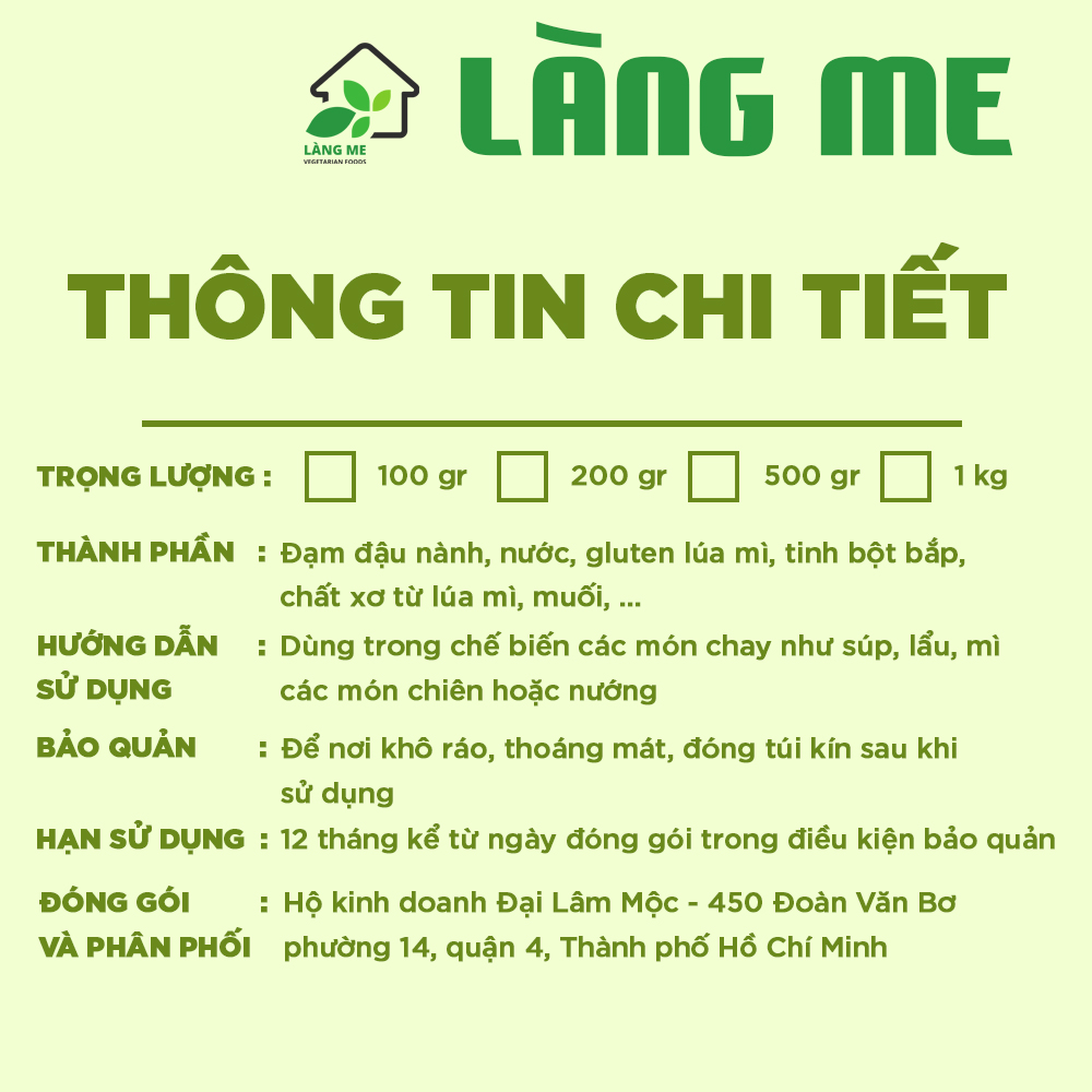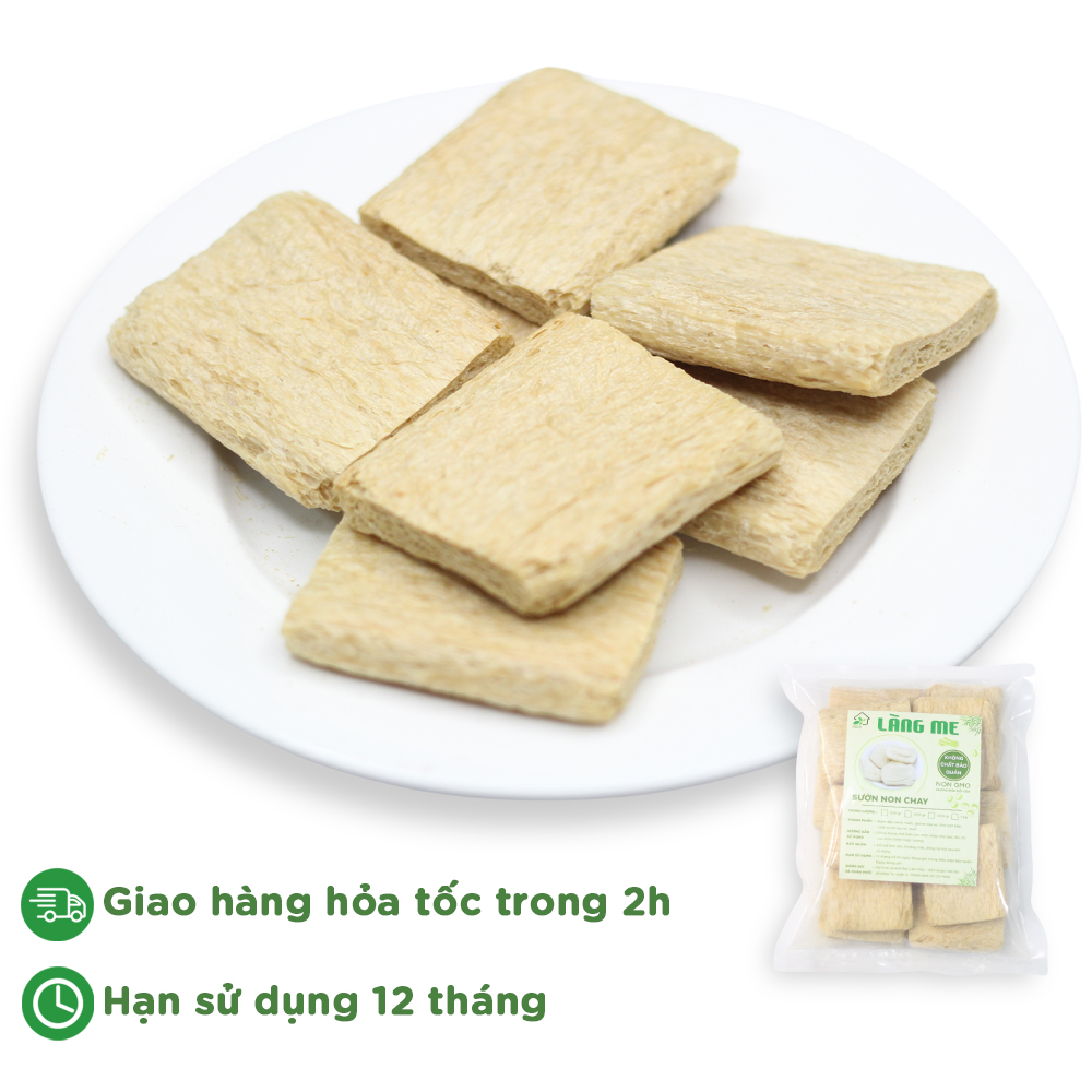 Sườn Chay Loại Ngon Thành Phần Tự Nhiên Không Chất Bảo Quản Không Biến Đổi Gen Sườn Non Chay Làng Me ( 1 Kg và 5 Kg )   Sản phẩm thực phẩm chay Làng Me cam kết: + Cam kết Chất Lượng Ngon - Dịch Vụ Hoàn Hảo + Giao nhanh chóng - Hỏa tốc 2h nội thành + Đóng gói cẩn thận bằng cả tấm lòng + Sản phẩm sản xuất mới , Thời hạn sử dụng dài + Cam kết đổi , hoàn trả hàng miễn phí nếu không hài lòng + Hàng ngon loại 1 , cam kết chất lượng Vệ Sinh An Toàn Thực Phẩm + Phản hồi , chăm sóc Khách Hàng 24/7 Thành phần : + Thực phẩm chay Làng Me làm từ 100% đậu nành, nước, lúa mì, tinh bột bắp,.. + Không chất bảo quản + Không biến đổi gen (non GMO) Hướng dẫn chế biến : + Đầu tiên, bạn đem sườn non chay ngâm với nước ấm trong khoảng 15 phút cho mềm ra. + Sau đó vớt ra, rửa lại với nước khoảng 2 - 3 lần cho thật sạch rồi vắt cho ráo nước, bắt đầu chế biến Gợi ý một số món ăn với Sườn non chay : + Sườn non chay chiên + Sườn non chay khìa nước dừa + Sườn non chay xào chua ngọt