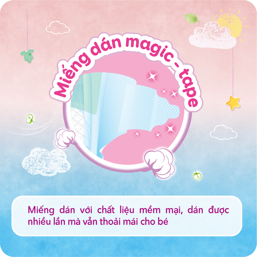 - Hệ thun Magic Fit: Co giãn linh hoạt theo từng cử động của bé nên miếng tã luôn vừa vặn, thoải mái lại chống tràn hiệu quả hơn.