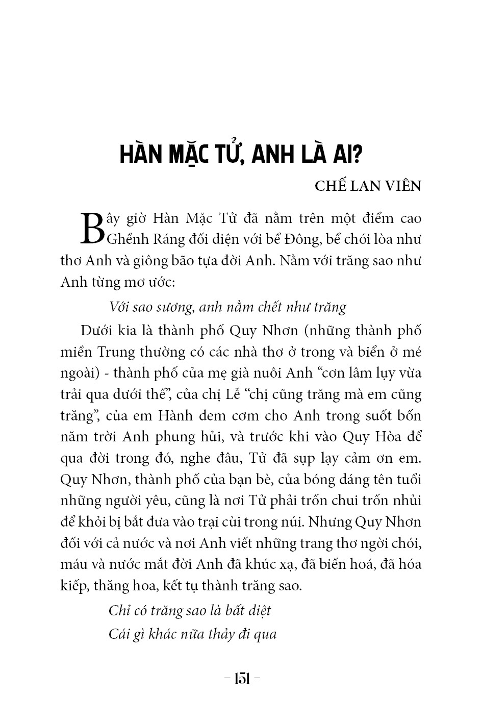“Hàn Mặc Tử được sinh ra cho thơ. Sinh thời, Hàn đã sống bằng thơ. Bây giờ và mai sau Hàn vẫn sống bằng thơ. Bởi vì Hàn đã chết cho mỗi lời thơ. Đó là bài học về thơ đắt giá và sáng giá nhất của muôn đời.” - Nhà phê bình văn học CHU VĂN SƠN
