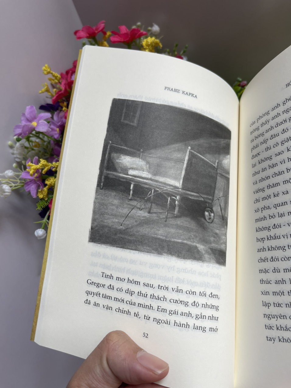 "Một sáng tỉnh giấc sau những giấc mơ xáo động, Gregor Samsa, nằm trên giường, nhận thấy mình đã biến thành một con côn trùng khổng lồ. Anh nằm ngửa trên cái lưng rắn như thể được bọc giáp sắt, và khi dợm nhấc đầu lên, anh nhìn thấy bụng mình khum tròn, nâu bóng, phân chia làm nhiều đốt cong cứng đờ, tấm chăn bong đắp trên bụng đã bị xô lệch, gần tuột hẳn. Chân anh nhiều ra, mảnh khảnh đến thảm hại so với phần còn lại của thân hình to đùng, vung vẩy bất lực trước mắt anh."