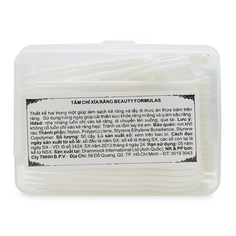 - Tăm chỉ xỉa răng Beauty Formulas với thiết kế 2 trong 1 giúp làm sạch kẽ răng và lấy đi thức ăn thừa bám trên răng. Sử dụng sản phẩm hằng ngày sẽ cải thiệu sức khỏe răng miệng và giảm sâu răng.