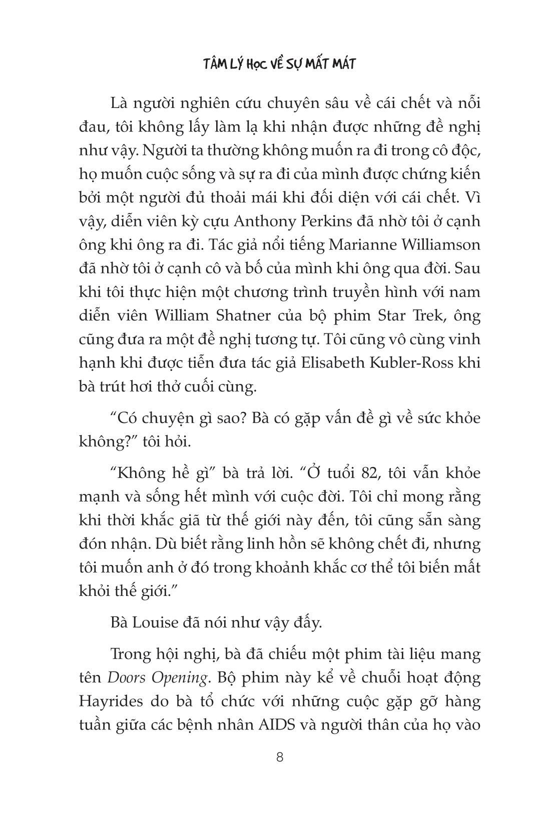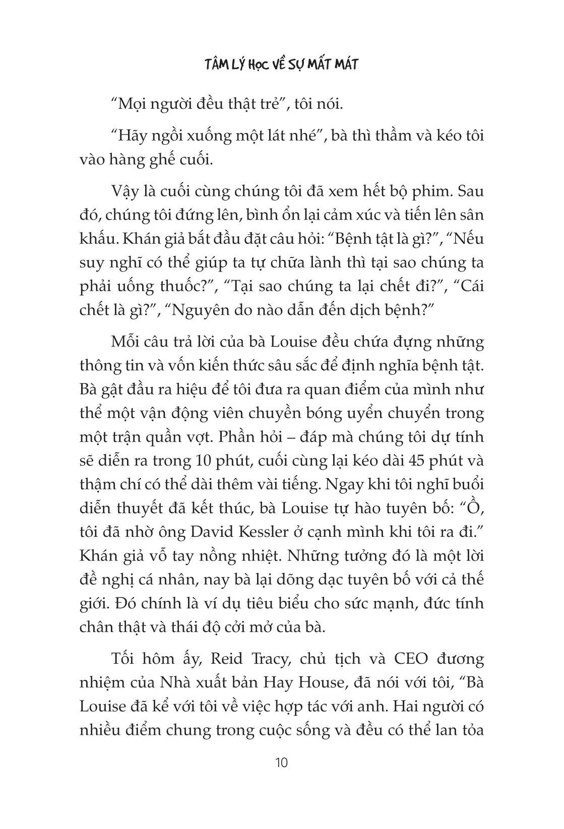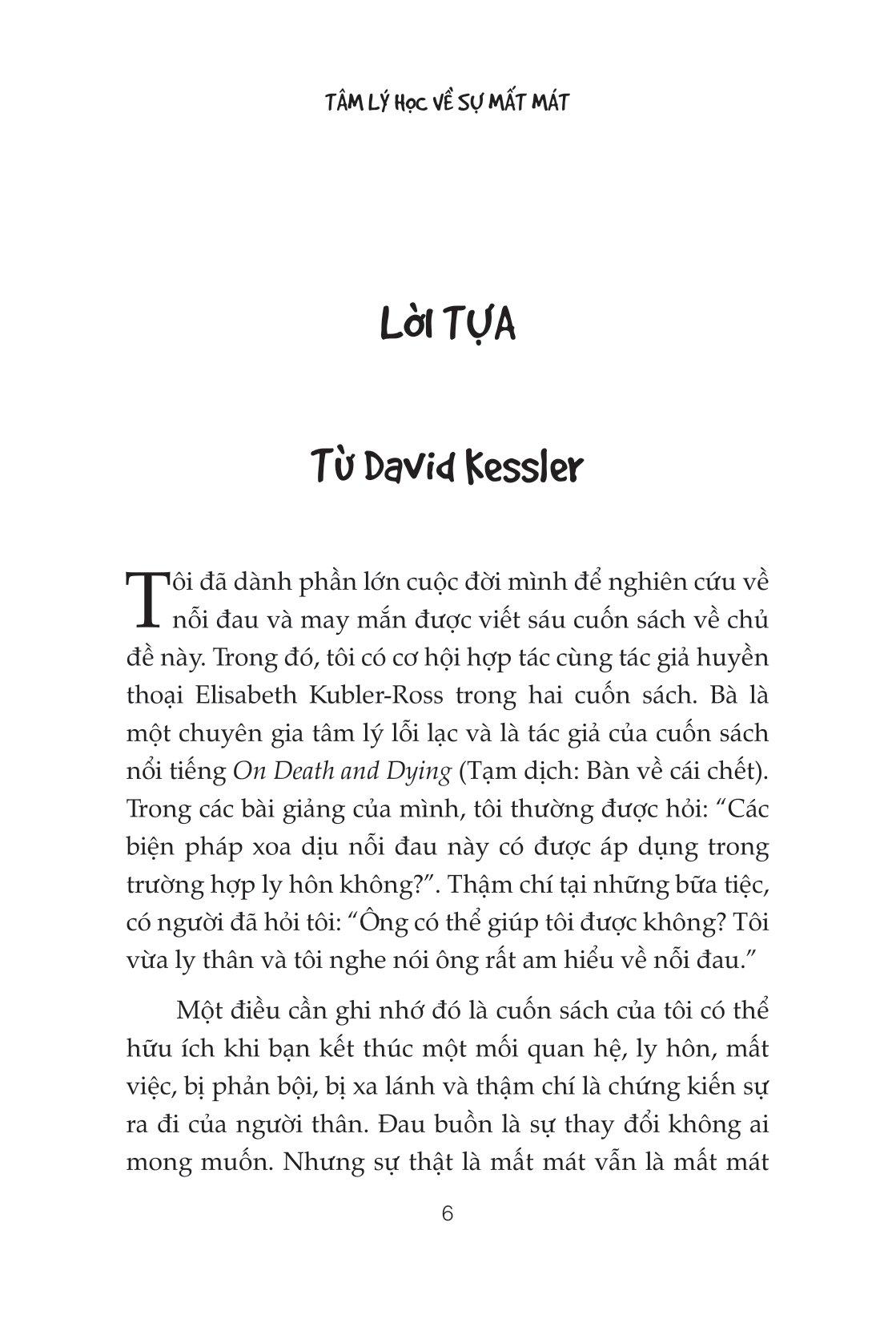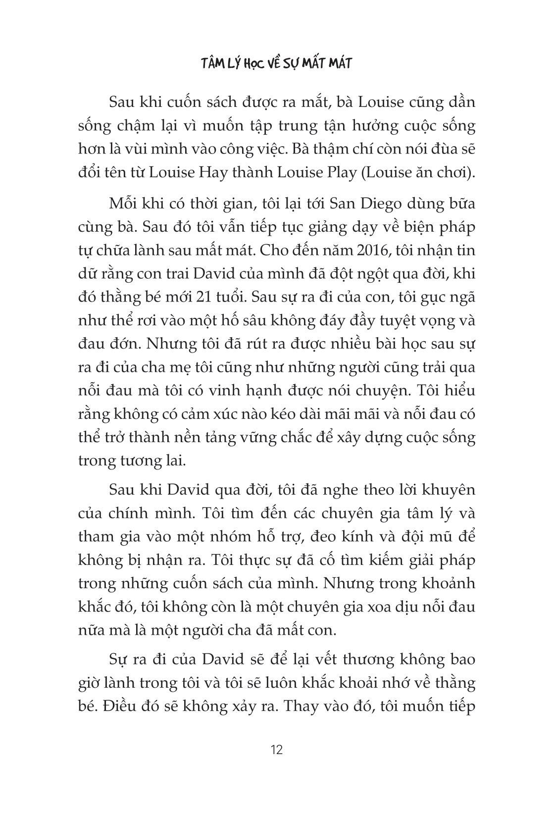 Tâm Lý Học Về Sự Mất Mát - Tìm Kiếm Giá Trị Bình Yên Trong Sự Đổ Vỡ Qua 7 chương sách bạn sẽ tìm thấy sự an lạc và bình yên trên hành trình của m.ình Chương 1: Thay đổi suy nghĩ về sự mất mát Chương 2: Chia ly và đột phá Chương 3: Ly hôn theo cách khác Chương 4: Sự ra đi của người thân thương Chương 5: Trân trọng sự ra đi của thú cưng Chương 6: Tình yêu khác, mất mát khác Chương 7: Chữa lành trái tim Hiểu về nỗi đau, sự mất mát Đa phần chúng ta sẽ không hiểu được nỗi đau cho đến khi chúng ta phải thực sự đối mặt với nó. Đau buồn không phải là căn bệnh quái ác cần được c.hữa trị mà đó là một phần tự nhiên của cuộc sống. Khi trải qua những nỗi đau những suy nghĩ méo mó thường xuất hiện trong tâm trí bạn dẫn đến trạng thái độc thoại nội tâm khi phải nhớ lại những suy nghĩ cũ nhiều lần. Bạn sẽ dần thoát được nỗi đau này nhanh chóng cho dù là cuộc chia tay đau đớn, cuộc ly hôn tồi tệ hay cái chết đau thương nhất. Không phải né tránh hay chạy trốn nỗi đau thay vào đó là để bản thân trải qua và cho phép m.ình sống cuộc đời mới với tình yêu thương, thay vì nỗi bi ai. Nỗi đau có mặt tích cực không? Bạn sẽ không bao giờ nghĩ rằng nỗi đau có thể mang lại những điều tích cực. Khi an ủi người đang đau buồn điều quan trọng là không cố nói theo hướng “trong cái rủi có cái may”. Ví dụ khi người bạn yêu quý qua đời thì chẳng có “cái may” nào cả. Điều thực sự tồn tại là khi chấp nhận mất mát, bạn có thể tìm thấy tầng ý nghĩa sâu sắc hơn. Bên cạnh đó, nếu bạn ngừng đổ lỗi cho các sự việc đã xảy ra, bạn sẽ tìm thấy sự vĩ đại – sức mạnh của nỗi buồn. Chúng ta thường không nhận ra nhưng sức mạnh chữa lành của nó vô cùng phi thường giống như việc cơ thể phục hồi sau tai nạn. Nỗi đau thay đổi và tái tạo lại một cuộc sống đã hủy hoại như chữa lành tâm hồn bị tổn thương. Trải qua nhiều chuyện nếu một người không thể chữa lành nguyên nhân là do suy nghĩ tiêu cực che mờ sự chữa lành thực sự. Khi ấy hãy suy nghĩ về điều tích cực: Nỗi đau luôn phát huy tác dụng khi có tình yêu Nỗi đau luôn được chữa lành khi có tình yêu Cuốn sách Tâm lý học về sự mất mát giúp được gì?