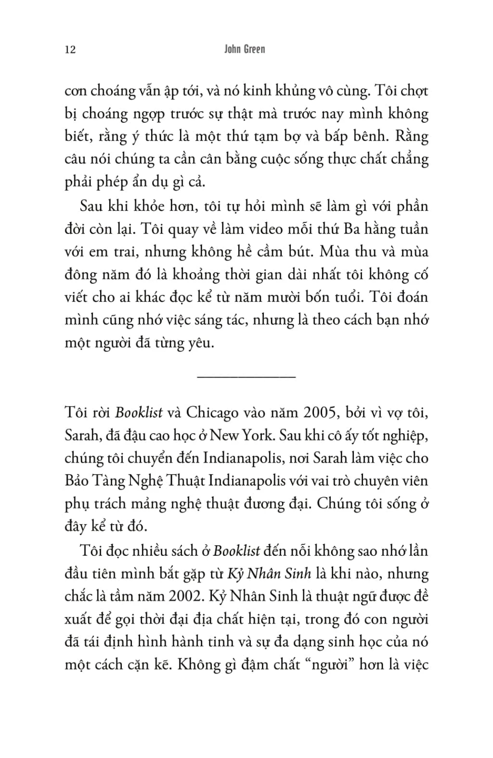 Tản Mạn Về Thế Giới - Đánh Giá Kỷ Nhân Sinh TRONG KỶ NHÂN SINH, CHẲNG CÓ KẺ ĐỨNG NGOÀI THỜ Ơ QUAN SÁT. MÀ TẤT CẢ ĐỀU CÙNG THAM GIA. Kỷ nhân sinh là thời đại địa chất hiện tại, khi con người đang định hình một cách sâu sắc diện mạo Trái Đất và sự đa dạng sinh học của nó. Thông qua tuyển tập các bài viết được chuyển thể và mở rộng từ podcast của chính mình, nhà văn ăn khách John Green đã đánh giá các khía cạnh khác nhau của Trái Đất do con người kiến tạo theo thang điểm năm sao—từ bàn phím QWERTY, khung cảnh hoàng hôn rực rỡ đến bầy ngỗng Canada và Chim cánh cụt Madagascar. Hài hước, tréo ngoe và giàu hình ảnh, các bài viết đã phác họa nên những nghịch lý của nhân loại đương đại. Sở hữu nguồn sức mạnh to lớn, nhưng con người cũng thật mềm yếu; nghịch lý càng trở nên rõ nét hơn khi loài người phải đối mặt với đại dịch toàn cầu vừa chia cắt lại cũng vừa gắn kết chúng ta với nhau. Các bài viết trong "Đánh giá kỷ nhân sinh" một lần nữa cho thấy tài kể chuyện hiếm có của John Green. Tác phẩm là cuộc hành trình khám phá đầy cảm hứng về những con đường mà chúng ta đã khai mở, đồng thời là một lời tụng ca chân thành về tình yêu dành cho thế giới.