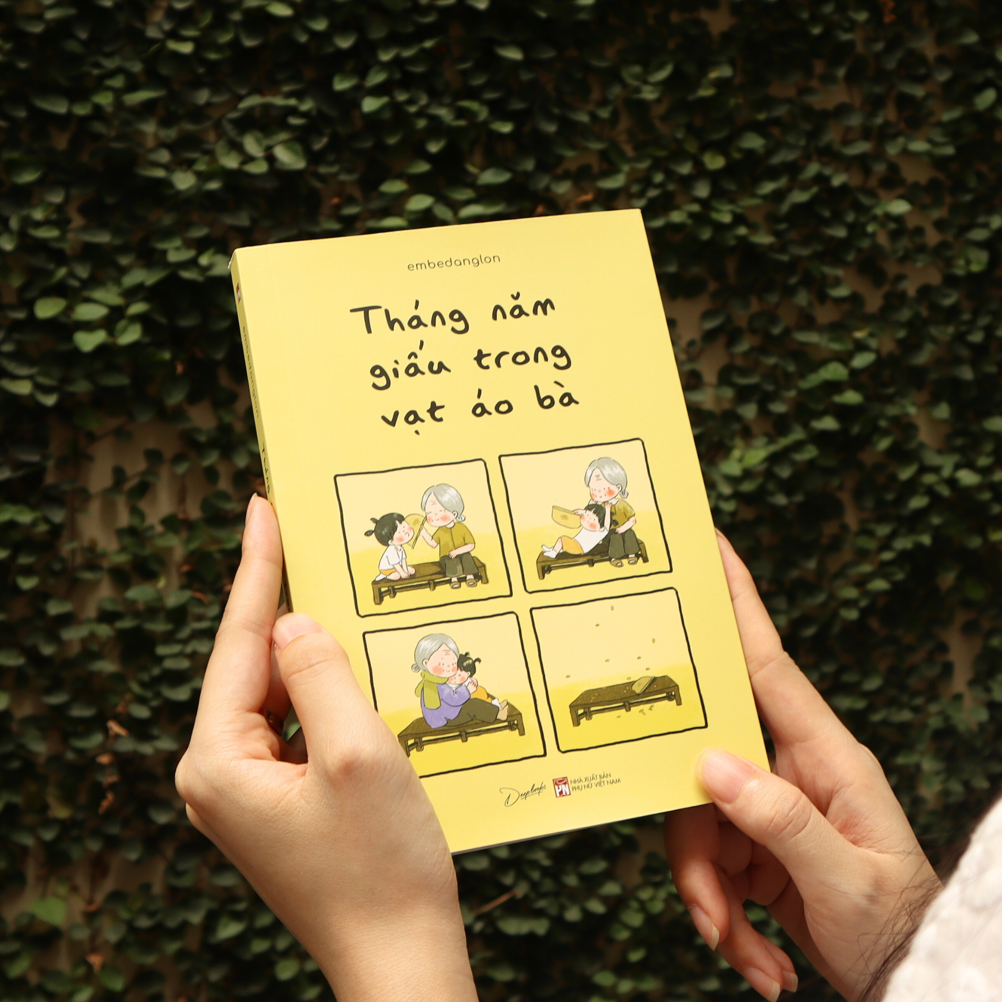 “Tháng năm giấu trong vạt áo bà” là cuốn sách tranh khẽ mở ra cánh cửa trở về tuổi thơ - nơi ta từng ước mình mãi không lớn, để được sồng hoài trong vòng tay chở che của gia đình. Trong tác phẩm này, tác giả embedanglon không chỉ gửi gắm những dòng chữ mộc mạc mà còn tự tay vẽ nên những bức minh họa dung dị và thân thương. Mỗi bức vẽ như một mảnh ghép dịu dàng về hình bóng những người đã che chở và nuôi dưỡng ta trong cả thuở ấu thơ: là làn khói bếp bảng lảng, mùi nắng đồng thơm, tiếng ru à ơi ngân trong vạt áo bà. Đâu đó là chiếc kẹo ngọt, con tôm bóc sẵn ông dành phần riêng cho đứa cháu nhỏ; là bữa cơm nhà ngọt lành mẹ nấu, hay cái mùng, chiếc quạt bố lặng lẽ sắp sẵn. Tất cả kết lại thành dòng chảy yêu thương của gia đình, âm thầm, giản dị nhưng đủ để nâng đỡ ta vững vàng suốt một đời.