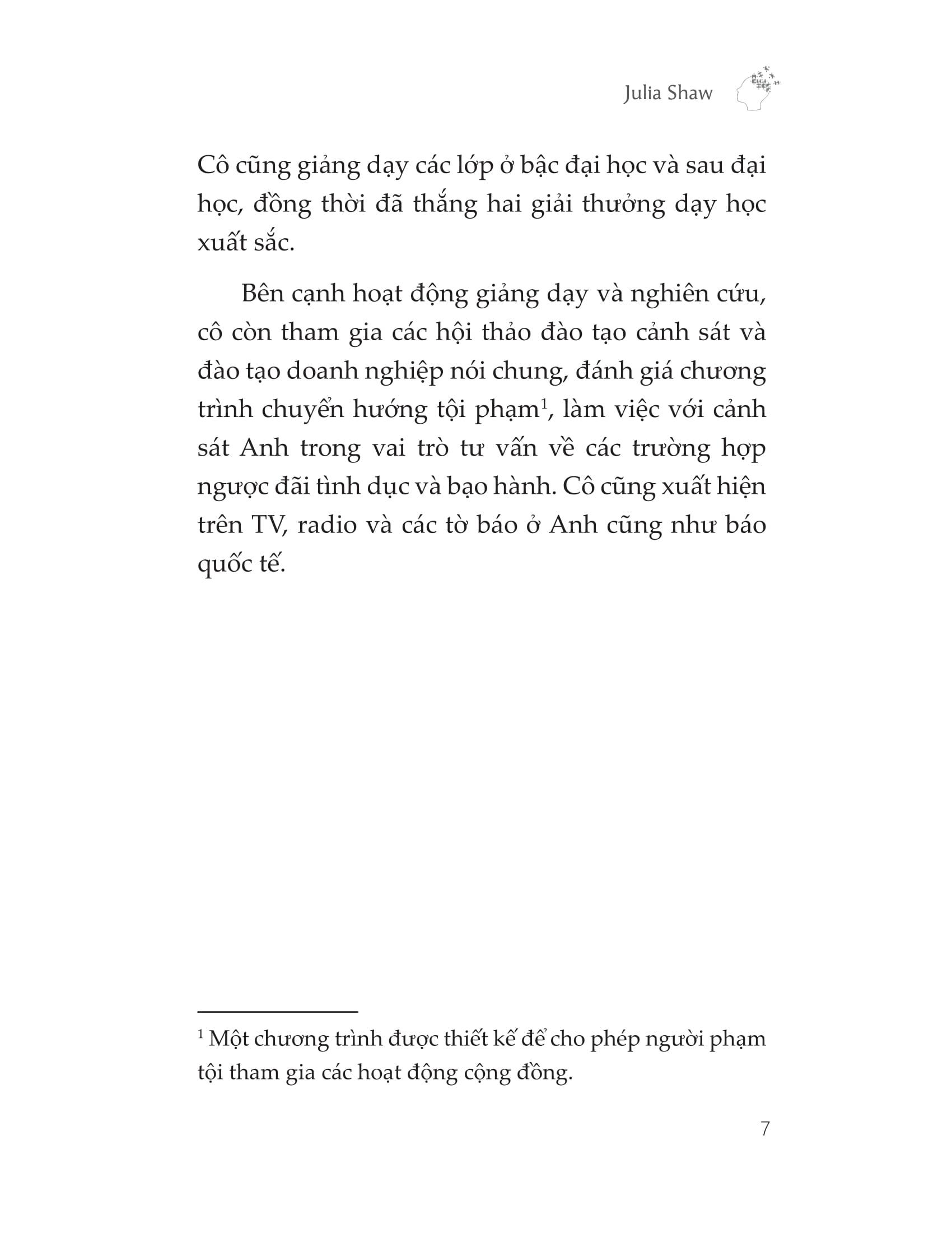 - Tác giả: Tiến sĩ Julia Shaw là một giảng viên và nhà nghiên cứu kỳ cựu của Trường Luật và Khoa học Xã hội, Đại học London South Bank, đồng thời là một trong số ít chuyên gia trên thế giới thực hiện nghiên cứu về những sai sót trí nhớ phức tạp liên quan đến các sự kiện cảm xúc cá nhân - hay còn gọi là những “ký ức sống động nhưng hoàn toàn không có thật”. Tiến sĩ Shaw xuất bản nhiều bài viết khoa học trên các tạp chí học thuật quốc tế, xây dựng giáo trình, thường xuyên cộng tác với tạp chí khoa học nổi tiếng Scientific American, thỉnh giảng và tham gia thuyết trình tại các hội thảo trên khắp thế giới. Cô cũng giảng dạy các lớp ở bậc đại học và sau đại học, đồng thời đã thắng hai giải thưởng dạy học xuất sắc.