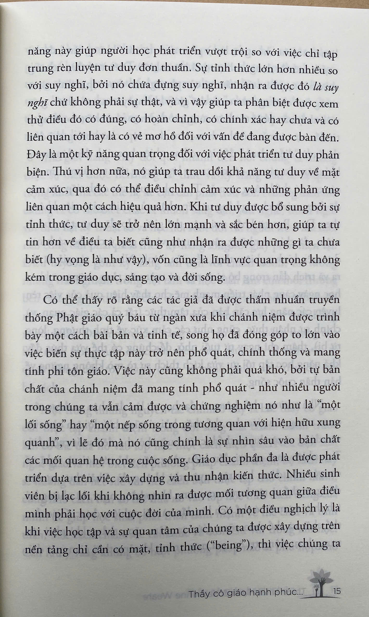 Đánh thức khả năng sáng tạo và trí tưởng tượng của bản thân trong suốt cuộc đời theo cách thức này là một yếu tố quan trọng dẫn tới thành công và hạnh phúc như tiêu đề của bộ sách. Một trong những nguyên tắc chính ở đây là các thầy cô giáo cần thực tập chánh niệm trong đời sống của chính mình trước khi có thể đưa nó vào lớp học một cách hiệu quả. Nếu bạn làm nghề giáo và mới biết đến phương pháp chánh niệm, bộ sách này sẽ hướng dẫn hết sức chi tiết cách bạn thực tập cho chính mình, cũng như cách bạn có thể đưa nó vào lớp học theo cách riêng của mình để giúp học sinh phát triển lành mạnh về thể chất và tinh thần, biết cách chăm sóc cảm xúc và có niềm vui trong khi học. Cần lưu ý rằng không có một phương pháp nào là phù hợp cho mọi hoàn cảnh. Cái hay của cách nhìn này là cho bạn một loạt các lựa chọn để thử nghiệm và trên hết là nhắc bạn nhớ rằng chính sự sáng tạo của riêng bạn, được nuôi dưỡng bởi sự thực tập chánh niệm, sẽ mang đến muôn vàn những cơ hội mới và đầy thú vị. Nói một cách thực tế thì học trò của bạn sẽ là người giúp khơi mở nguồn tuệ giác đó trong bạn. Các em chính là những người thầy chánh niệm vĩ đại nhất của bạn. Điểm hay của phương thức tiếp cận này là nó có thể bắt nguồn từ tình yêu nghề và tấm lòng mong mỏi học trò tiến bộ, được ấp ủ và truyền đạt bởi chính trực giác và kinh nghiệm thực tiễn của bạn; tất cả những điều này đều dựa vào công phu thực tập trong từng thời khắc của bạn. Theo như tôi nghiệm thấy, những băn khoăn, học hỏi, quán chiếu cứ lớn lên không ngừng trên mảnh đất nuôi dưỡng ấy.