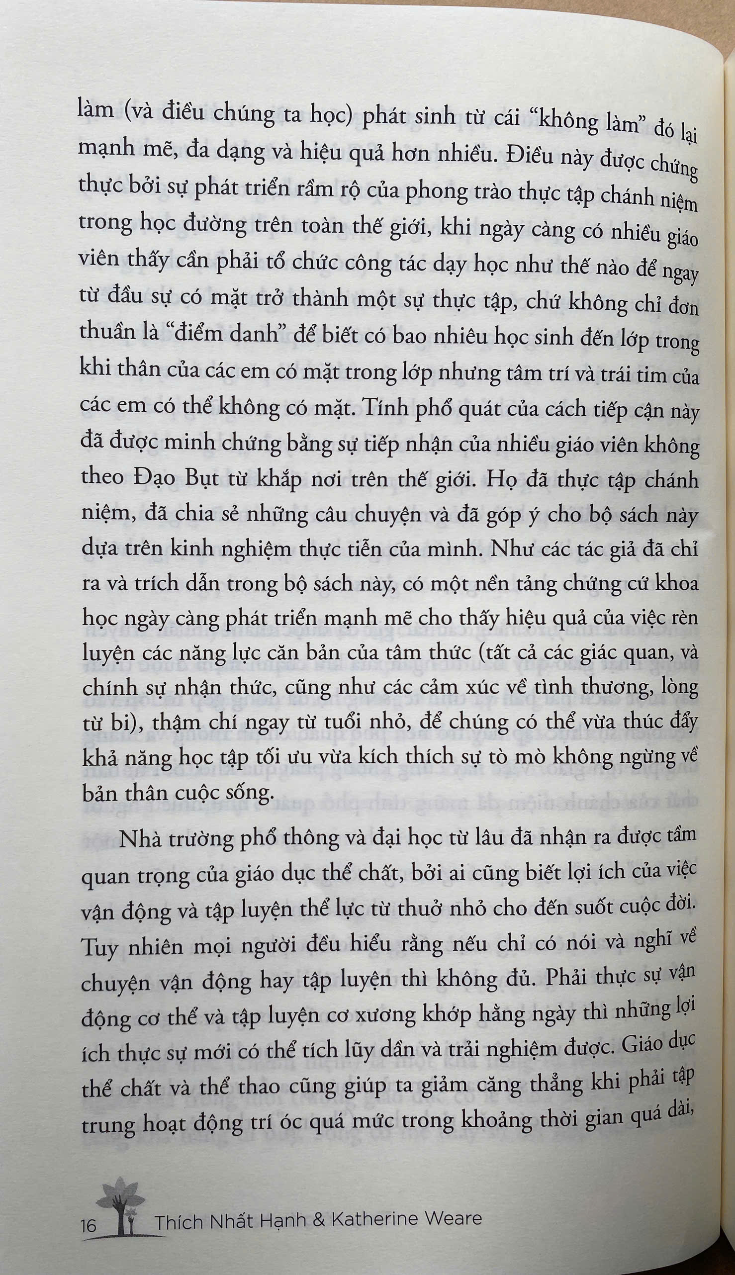 “Thầy cô giáo hạnh phúc sẽ thay đổi thế giới” - bộ sách bạn đang cầm trên tay là một món quà đặc biệt quan trọng - hay nói cách khác là một sự trao truyền - từ Thiền sư Thích Nhất Hạnh trao tặng vào giai đoạn chín muồi của một nhân cách vĩ đại. Bạn sẽ thấy rằng nó là kết tinh tình thương sâu sắc của Thiền sư đối với những người trẻ và sự mong mỏi không ngừng về một nền giáo dục bồi dưỡng tài và đức cho các thế hệ mai sau. Ở mỗi trang, bạn có thể cảm được sự tôn vinh dành cho những con người đang thực hiện sứ mệnh này, thường là âm thầm không ai biết, và khối lượng công việc khổng lồ mà họ gánh vác từng ngày nhằm phục vụ cho công cuộc kiến tạo, chuyển hóa và hàn gắn thế giới của chúng ta từ dưới lên, từ thế hệ này sang thế hệ khác - đó là những người thầy, người cô. Đây cũng đồng thời là tác phẩm được kết tinh từ sự cộng tác đầy cảm hứng với giáo sư Katherine Weare, một nhà giáo dục và cũng là một giáo viên về chánh niệm, người đã có nhiều năm nghiên cứu những tác động của thực tập chánh niệm trong môi trường học đường, và đội ngũ các cây bút cố vấn, những học trò lớn của Thiền sư từ Làng Mai. Cùng nhau họ đã thiết kế một cẩm nang thiền tập mang tính đa diện và rất dễ sử dụng để giúp các thầy cô giáo có thể đem chánh niệm vào lớp học cũng như vào đời sống của chính mình bằng nhiều hình thức.