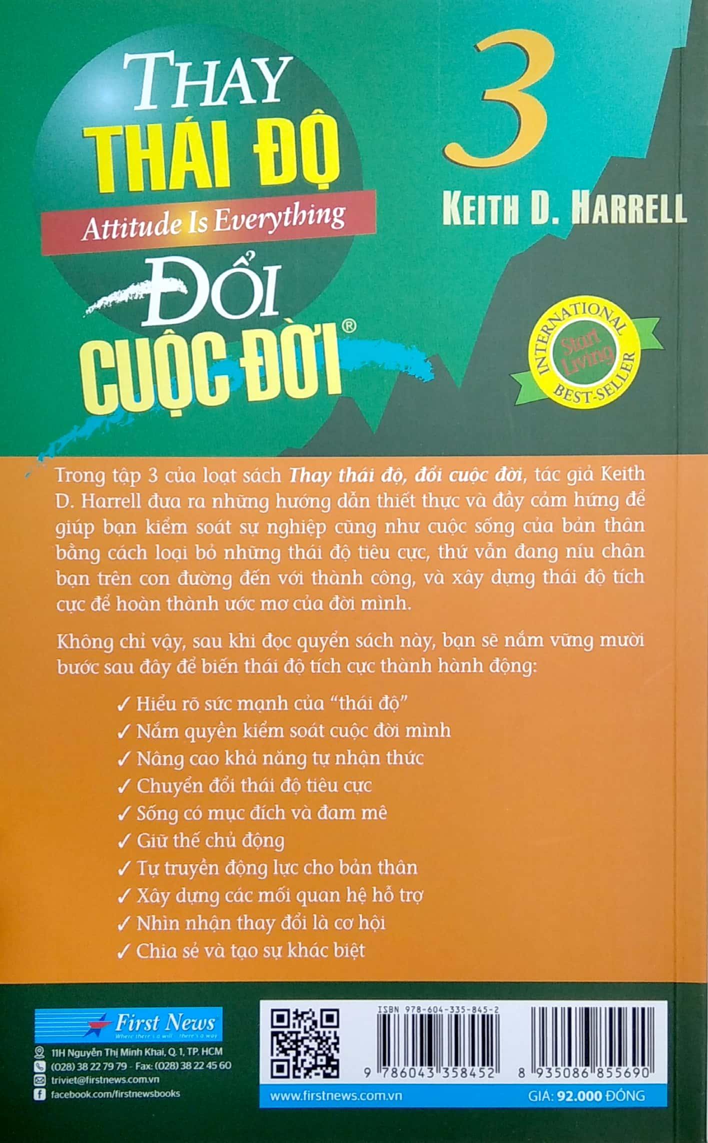 Đây không phải là một khẩu hiệu sáo rỗng mà đã được chứng minh qua thực tế. Từ nhiều năm nay, những khám phá, trải nghiệm về thái độ sống, tư duy tích cực của Keith Harrell, cũng như của Art Berg, Debbie Fields, Jeff Keller, Jim Rohn, Nido Qubein… đã được hàng triệu độc giả áp dụng thành công trong đời sống hằng ngày của mình. Mọi vấn đề trong cuộc sống đều khởi phát từ thái độ của bạn: thái độ đối với bản thân, gia đình, bạn bè và xã hội; thái độ trong công việc và trong cuộc sống đời thường; thái độ tích cực trước những hoàn cảnh khó khăn, khắc nghiệt; thái độ trân trọng những giá trị tốt đẹp của cuộc số