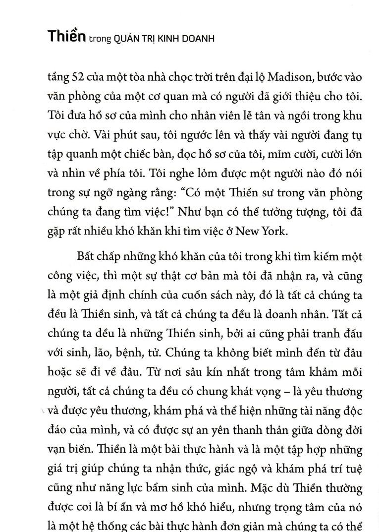 Qua Thiền Trong Quản Trị Kinh Doanh, Marc Lesser cuốn sách Marc Lesser cung cấp cho bạn đọc cá công cụ,ý tưởng có thể giúp bạn tự tin trong nổ lực nhìn nhận bản thân,công việc của mình và thế giới theo đúng bản chất của chúng.Tích hợp Thiền với thực tiễn kinh doanh không chỉ giúp chúng ta khám phá ra công việc và bản thân mình,mà còn giúp ta vượt qua giới hạn,trải nghiệm cuộc đời theo cách trọn vẹn nhất,cả sự nguyen sơ cũng như sự bao la,rộng lớn của nó.