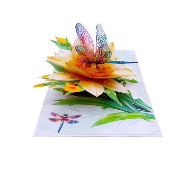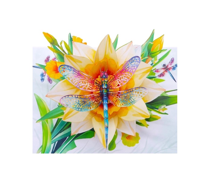 Thiệp 3D chuồn chuồn và hoa thủy tiên vàng mang đến vẻ đẹp tươi sáng, rực rỡ. Khi mở ra, bông hoa lớn bung nở cùng chuồn chuồn đầy màu sắc bay lượn sống động,