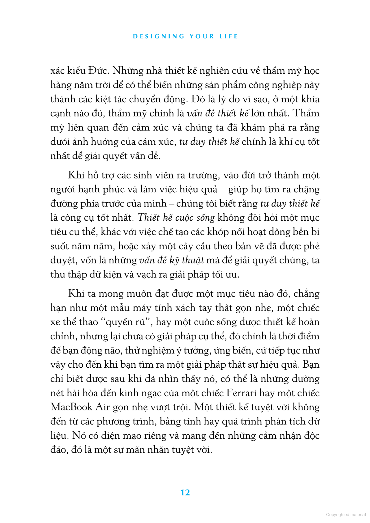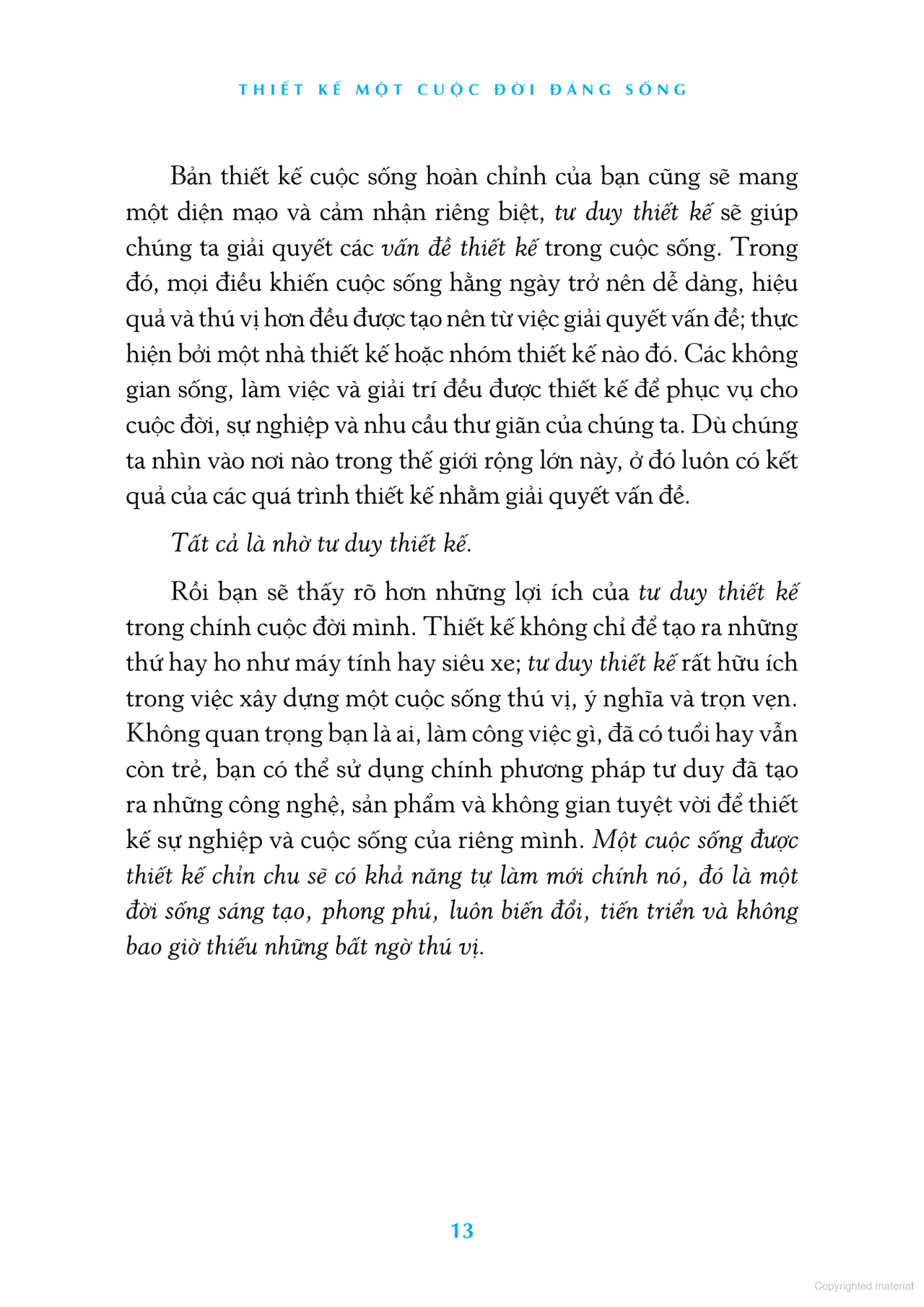 Đọc "Thiết kế một cuộc đời đáng sống", bạn đọc sẽ gặp những người trẻ lạc lối, những nhân vật "chưa biết phải làm gì với cuộc đời mình", những con người tài giỏi nhưng gặp khủng hoảng trong sự nghiệp, cuộc số Với mỗi câu chuyện và vấn đề, các tác giả ứng dụng phương pháp tư duy thiết kế để giải quyết, từ đó bạn sẽ học được cách áp dụng kiểu tư duy này vào giải quyết vấn đề của chính mình.