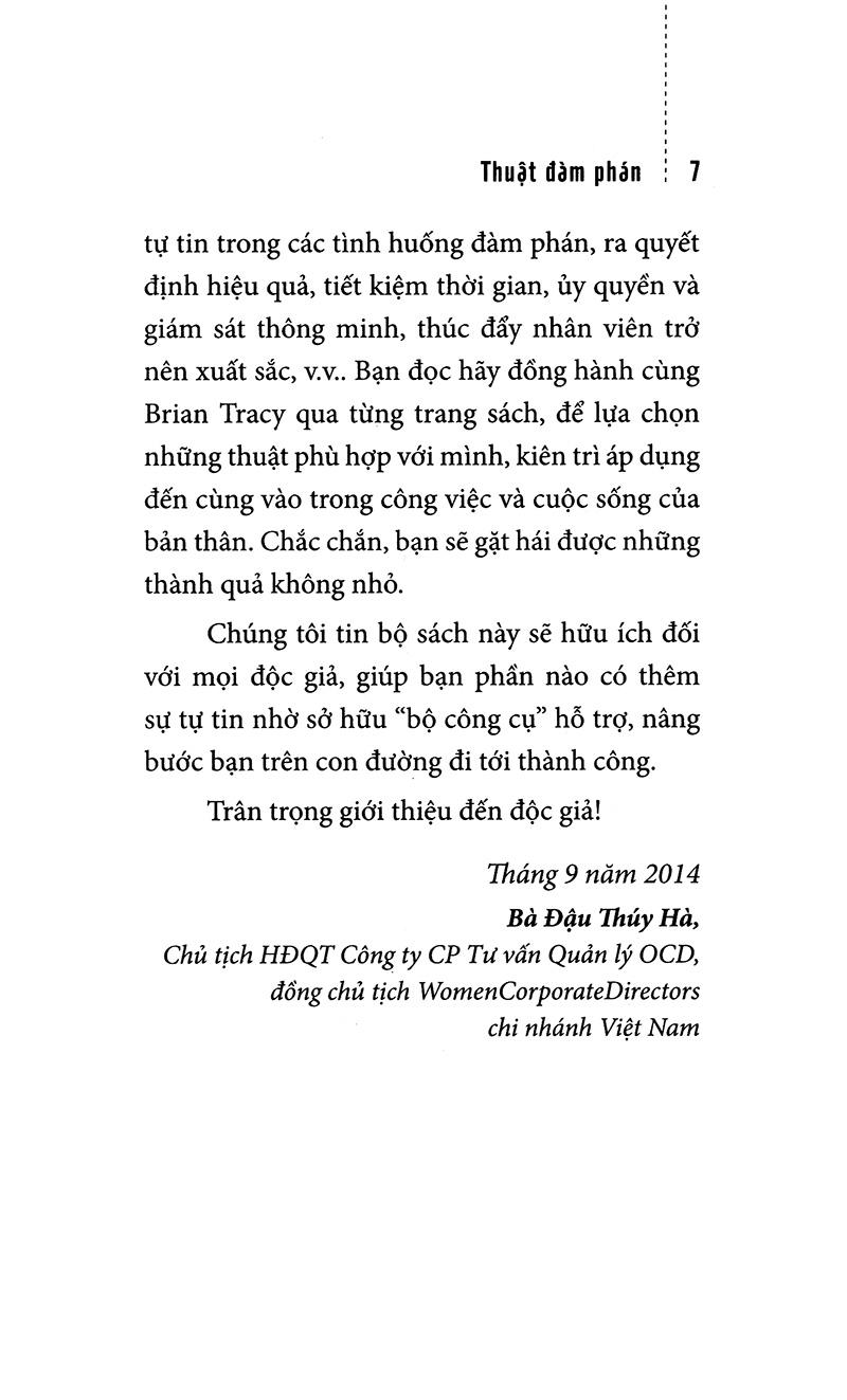 Trong sự nghiệp thành công của Brian Tracy đã đàm phán các hợp đồng trị giá hàng triệu đô-la. Nhờ trải nghiệm đó, ông đã đúc rút và đưa những bí quyết vào cuốn sách Thuật đàm phán này như một cuốn cẩm nang ngắn gọn giúp bạn trở thành một nhà thương thuyết bậc thầy nhờ: