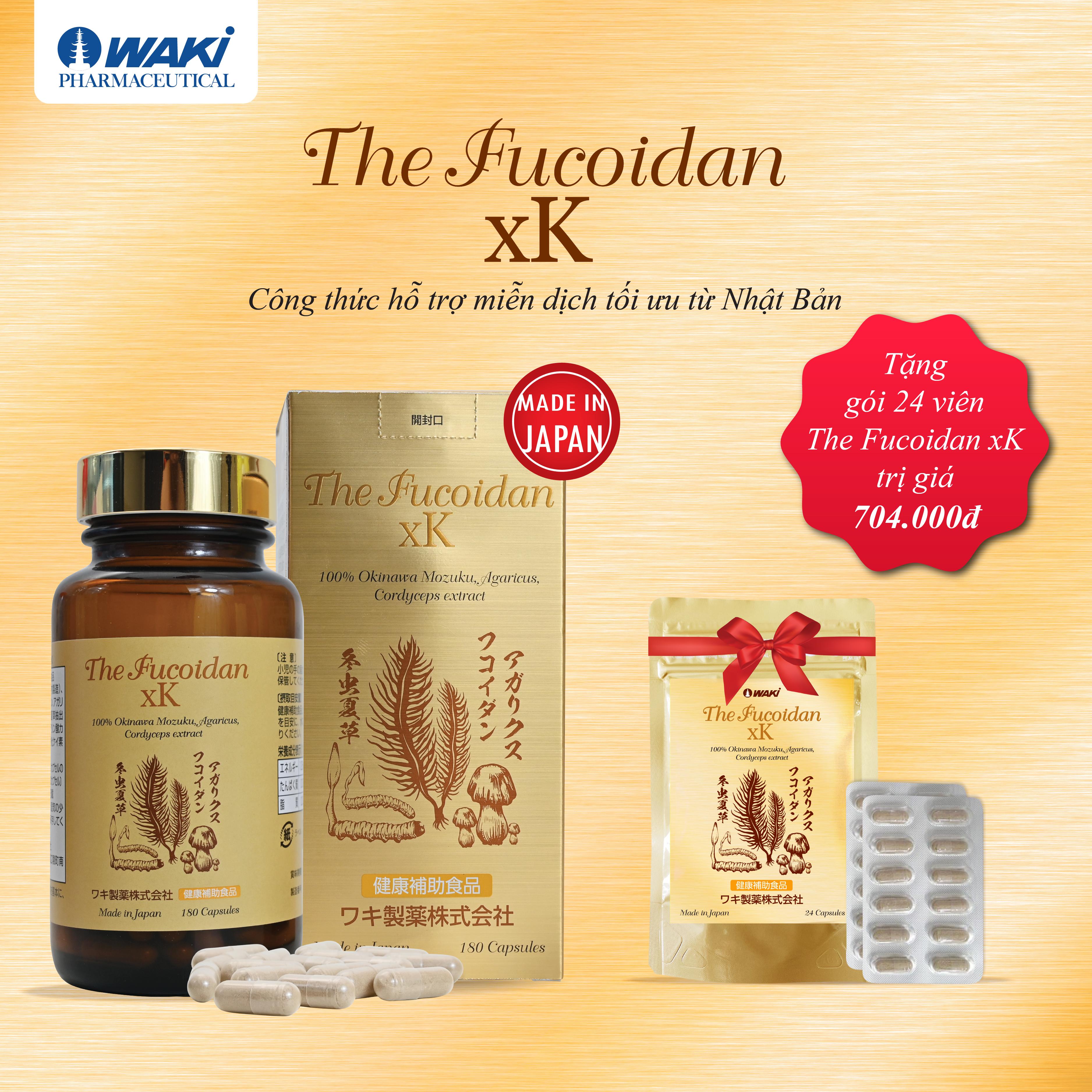 Thực phẩm bảo vệ sức khỏe The Fucoidan xK có công thức đặc biệt từ những thành phần thiên nhiên quý giá: 100% tảo nâu vùng Okinawa nổi tiếng của Nhật cùng 2 thành phần quý khác: nấm Agaricus và Đông trùng hạ thảo giúp tăng cường hỗ trợ sức khỏe. Sản phẩm được sản xuất bởi công ty Waki Pharma có truyền thống hơn 200 năm từ Nhật Bản. THÀNH PHẦN CHÍNH VÀ HÀM LƯỢNG (CHO 1 VIÊN) THE FUCOIDAN xK: