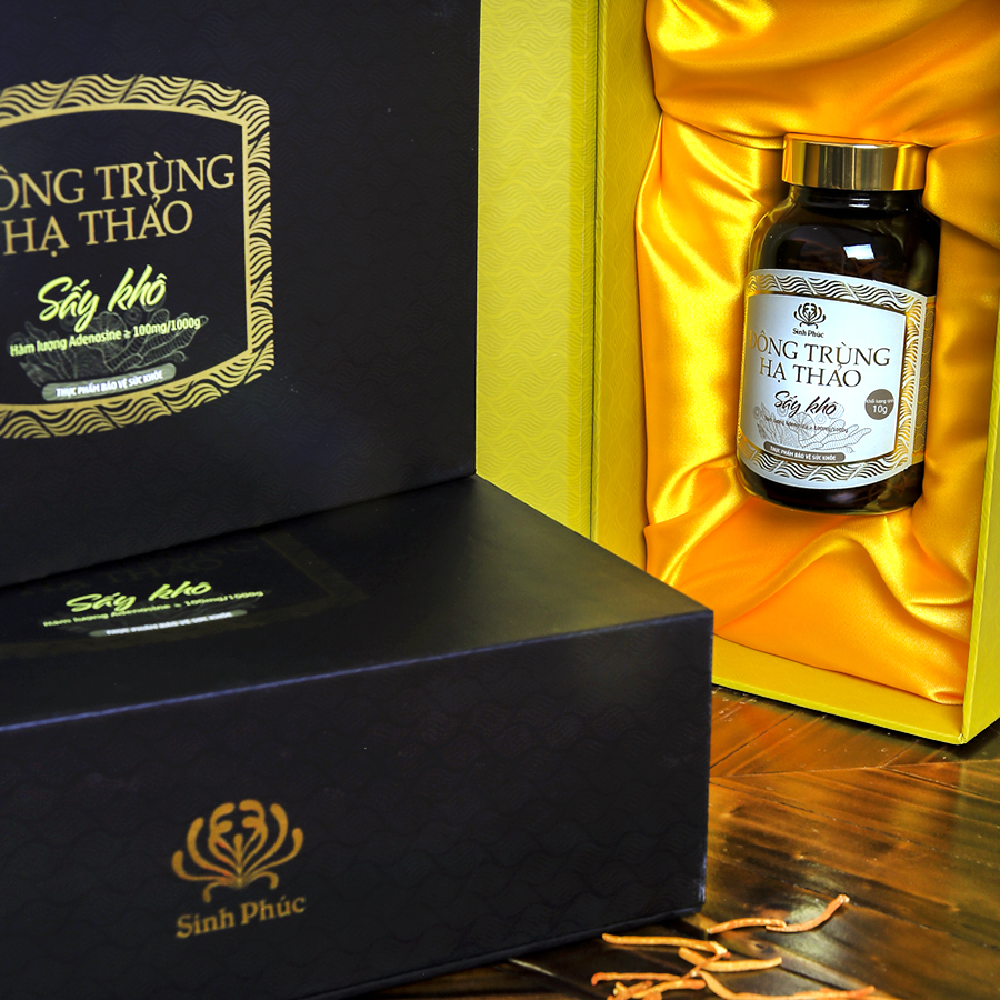 - Cordycepin ≥ 10,1 mg/g II. HỖ TRỢ ĐIỀU TRỊ BỆNH – Hỗ trợ điều trị bệnh ung thư, khối u: Trong điều trị bệnh ung thư dùng hóa trị và xạ trị có bổ sung thêm ĐTHT với liều 6g ĐTHT khô hoặc 36g ĐTHT tươi một ngày, liên tục sau 2 tháng sẽ có tác dụng kiềm chế phát triển của khối u, tăng khả năng miễn dịch và tăng thể lực. – Hỗ trợ điều trị bệnh thận: ĐTHT có tác dụng bổ thận và phục hồi chức năng của thận với bệnh nhân suy thận. Bệnh nhân suy thận mãn tính dùng ĐTHT với liều 3-5g khô hoặc 18-30g tươi một ngày liên tục sau 01 tháng chức năng của thận được cải thiện so với bệnh nhân không dùng ĐTHT. – Tác dụng điều hòa đường huyết với bệnh nhân đái tháo đường: Bệnh nhân đái tháo đường dùng với liều 3g ĐTHT khô hoặc 18g ĐTHT tươi một ngày có tác dụng làm giảm đường huyết trong bệnh đái tháo đường, lượng đường máu ổn định hơn. Các nghiên cứu cho thấy nếu kết hợp ĐTHT với thuốc khác hiệu quả sẽ đạt cao hơn – Bệnh phổi: ĐTHT có tác dụng với nhiều bệnh về phổi như hẹp phế quản, viêm phế quản, lao và hen. ĐTHT có tác dụng bổ phổi do khả năng thúc đẩy tăng sử dụng oxy, tăng sự lưu thông không khí trong phổi do đó giảm nhẹ các cơn hen. – Đối với tim mạch: ĐTHT có tác dụng làm ổn định nhịp tim, tác dụng với bệnh nhân bị loạn nhịp tim do cơ chế tác động của adenosins, các nucleosid. – Đối với gan: Sau 3 tháng sử dụng 6-9g ĐTHT khô hoặc 36-54g ĐTHT tươi một ngày tất cả các bệnh nhân đã thể hiện sự cải thiện đáng kể trong các thử nghiệm chức năng gan. – Chống suy giảm tình dục, bất lực và các chức năng sinh dục khác ở cả nam và nữ: Liều dùng 3g ĐTHT khô hoặc 18g ĐTHT tươi một ngày liên tục 40 ngày mức độ ham muốn tình dục cải thiện rõ rệt. ĐTHT làm tăng lượng tinh trùng, làm tăng chất dịch chứa tinh trùng và làm giảm lượng tinh trùng xấu. III. HƯỚNG DẪN SỬ DỤNG – Ăn trực tiếp: Dùng nước ấm nhẹ (30 độ C) rửa sơ phần sợi phía trên, sau đó ăn trực tiếp, nhai càng lâu càng tốt, ăn cả nhánh ĐTHT. – Pha trà: Cho 1-2g ĐTHT khô hoặc 6-12g ĐTHT tươi vào nước sôi ngâm 5-10 phút dùng cho 01 người, uống hàng ngày, sử dụng cả nước và nhánh ĐTHT, công dụng bồi bổ sức khỏe chống lão hóa. – Ngâm rượu: Ngâm 20g ĐTHT khô hoặc 120g ĐTHT tươi vào 1,5-2 lít rượu sau 30 ngày, mỗi tối dùng 20-30ml, công dụng tăng cường sức đề kháng, tăng cường sinh lý, kích thích tiêu hóa. – Ngâm mật ong: 15g ĐTHT khô hoặc 100g ĐTHT tươi ngâm 200-300ml mật ong trong 7-10 ngày, mỗi sáng uống 15ml dùng cả nhánh, công dụng làm đẹp da, chống lão hóa, tăng sức đề kháng cho người mệt mỏi căng thẳng. – Hầm canh: 20g ĐTHT tươi hoặc 4g ĐTHT khô cho vào canh hầm trước khi tắt bếp 2 phút, công dụng chống suy nhược cơ thể, bồi bổ sức khỏe cho người mới ốm, đang điều trị bệnh. – Nấu cháo: 1-2g ĐTHT khô xay nhuyễn và rắc lên bát cháo, dùng nóng. Công dụng bồi bổ sức khỏe cho người suy kiệt. – Đông Trùng Hạ Thảo hấp cơm: Cho 8-10 nhánh ĐTHT vào nồi cơm hấp chín và ăn ngay, công dụng tăng cường chức năng gan. IV. BẢO QUẢN – ĐTHT khô: Dùng trong 01 năm, bảo quản nơi mát mẻ, khô ráo, tránh tuyệt đối ánh sáng, kể cả ánh sáng đèn điện. V. LƯU Ý – Nguồn trích dẫn hỗ trợ điều trị bệnh “Đông trùng hạ thảo – Một dược liệu quý hỗ trợ điều trị các bệnh virus, ung thư, HIV/AIDS, đái tháo đường, suy giảm tình dục …và nghiên cứu phát hiện loài ĐTHT mới ở Việt Nam” của VS.GS.TSKH Đái Duy Ban (Chủ biên), Nhà xuất bản Y học. – Sản phẩm này không phải là thuốc và không cho tác dụng thay thế thuốc chữa bệnh. Nếu bạn đang mang thai, cho con bú hoặc đang dùng bất cứ loại thuốc nào, xin hỏi bác sĩ trước khi sử dụng.