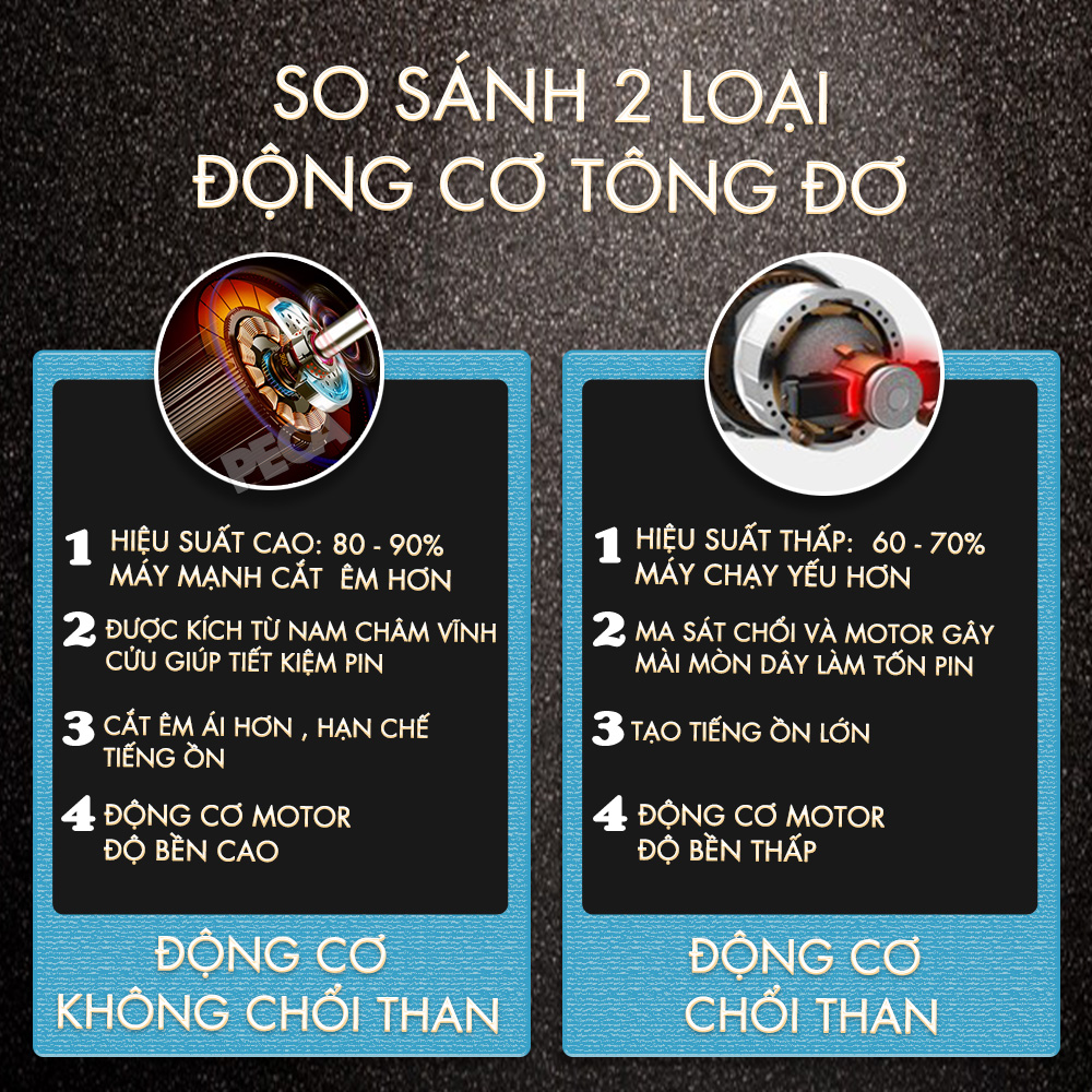 • Hoạt động êm ái: Mặc dù động cơ mạnh mẽ, máy vẫn hoạt động rất êm ái, không gây ra tiếng ồn lớn, tạo sự thoải mái cho người sử dụng cũng như khách hàng trong môi trường chuyên nghiệp. Tăng đơ chấn viền lưỡi kim cương đen DLC Kemei KM-2795 còn sỡ hữu một loại động cơ ưu việt , đó là động cơ không chổi than. Động cơ không chổi than mang lại nhiều ưu điểm như tuổi thọ cao hơn, hiệu suất cao hơn, tiết kiệm điện năng và ít tiếng ồn hơn so với động cơ chổi than. Để có thể thấy rõ sự khác biệt của loại động cơ không chổi than trên chúng ta có thể xem so sánh chi tiết về 2 loại động cơ này:   4/ Tốc độ cắt: Máy điều chỉnh đến 5 mức tốc độ cắt phù hợp sử dụng cho mọi nhu cầu. Việc điều chỉnh tốc độ trên tông đơ như Kemei KM-2795 là cực kỳ quan trọng vì mỗi loại tóc có đặc điểm khác nhau, từ dày, cứng đến mỏng, mềm. Tốc độ cao giúp cắt nhanh và dễ dàng tóc dày, trong khi tốc độ thấp phù hợp với tóc mỏng hoặc tạo kiểu chi tiết, giúp tránh gây hư hại cho tóc và đảm bảo độ chính xác. Điều này không chỉ tối ưu hiệu quả cắt tóc mà còn bảo vệ thiết bị và kéo dài tuổi thọ của máy.