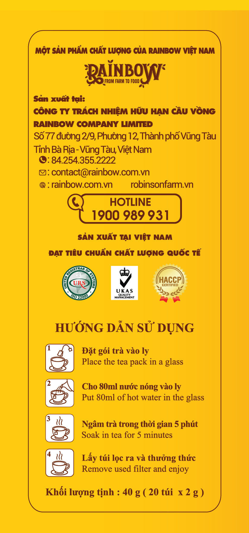 Trà đen nhãn vàng ROBINSON FARM là loại sản phẩm trà túi lọc cao cấp được chọn lọc từ những lá trà tươi nguyên, chất lượng nhất sẽ mang đến cho bạn tách trà thơm