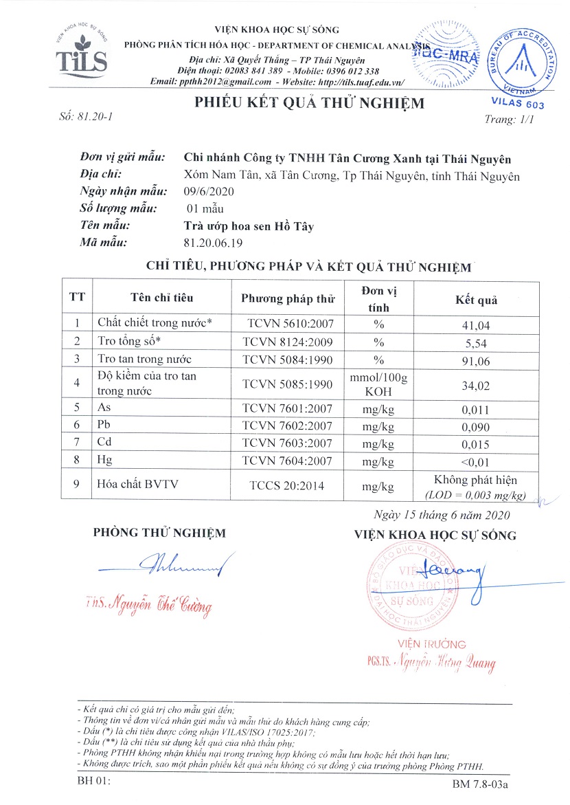 - Rót trà ra tống, từ tống chia đều ra các chén. Chú ý chỉ rót nước đến 1/2 chén trà, không rót đầy. THÔNG TIN NHÀ CUNG CẤP: Tân Cương Xanh là hãng sản xuất trà Việt Nam Thượng Hạng có uy tín và được biết đến bởi đông đảo người tiêu dùng. Công ty đã đầu tư đồng bộ từ vùng nguyên liệu rộng 50 ha ở Tân Cương (Thái Nguyên) đạt tiêu chuẩn VietGap, Nhà máy rộng 2,000 m2 với máy móc hiện đại nhập từ Đài Loan và hệ thống quản lý chất lượng ISO 9000 - 2009, bên cạnh đó công ty đã xây dựng mạng lưới chuỗi cửa hàng trưng bày&giới thiệu sản phẩm ở Hà Nội (10 cửa hàng), TP.HCM (03 cửa hàng), Đà Nẵng (02 cửa hàng) và Thái Nguyên (02 cửa hàng) và hệ thống đại lý phủ khắp 63 tỉnh thành trong cả nước. Công ty cũng tích cực tham gia các hội chợ triển lãm như Tôn Vinh Hàng Việt, Hội Chợ VietFood, ới mong muốn quảng bá rộng rãi đặc sản nổi tiếng của Việt Nam được biết đến không chỉ trong nước mà còn trên thị trường quốc tế. Các sản phẩm mang nhãn hiệu Tân Cương Xanh đã có mặt tại các thị trường khó tính như Anh, Hoa Kỳ, Nhật Bản, Đông Âu và được đóng nhận nồng nhiệt. Ngoài quy cách trà sen Hồ Tây, Tân Cương Xanh cũng cung cấp cho khách hàng nhiều mẫu mã hộp Trà Sen Tây Hồ khác nhau như Hộp Trà sen Tây Hồ Hứng Dừa, Long Phượ Hộp đẹp kết hợp với thứ trà Sen Tây Hồ thượng phẩm tạo nên một món quà tặng đẳng cấp và sang trọng không loại quà tặng nào có thể thay thế.