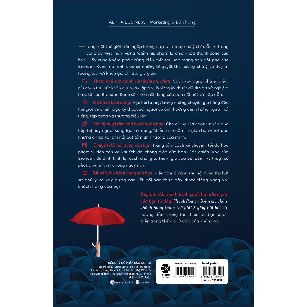 "Hook Point - Điểm níu chân khách hàng trong thế giới 3 giây hối hả" là một cuốn sách sâu sắc cung cấp các chiến lược và kỹ thuật có giá trị để thu hút và duy trì sự chú ý trong thế giới có nhịp độ nhanh và khan hiếm sự chú ý ngày nay. Cuốn sách đưa ra lời khuyên thiết thực về việc tạo ra những điểm hấp dẫn và hiệu quả để thu hút khán giả chỉ trong vài giây.