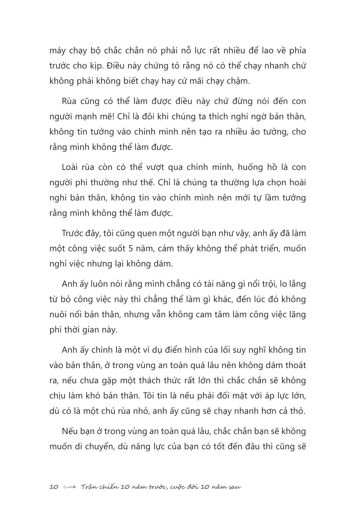 Trận Chiến 10 Năm Trước, Cuộc Đời 10 Năm Sau “Nếu chúng ta cho rằng bình phàm là đáng quý, ta sẽ hài lòng với bản thân của hiện tại, lựa chọn những điều dễ dàng, sống cho qua ngày mà quên mất trên đời có những người không màng tất cả để sống đời huy hoàng rực rỡ.” Các bạn trẻ, tương lai của các bạn đang được xây dựng và tích lũy dựa trên những quyết tâm ở ngay giây phút này. Vậy nên tuổi trẻ đừng chọn an nhàn, đừng tính toán thiệt hơn, đừng trì hoãn các mục tiêu, đừng nhụt chí sau thất bại. Trận chiến 10 năm trước chính là cuộc đời của bạn 10 năm sau!
