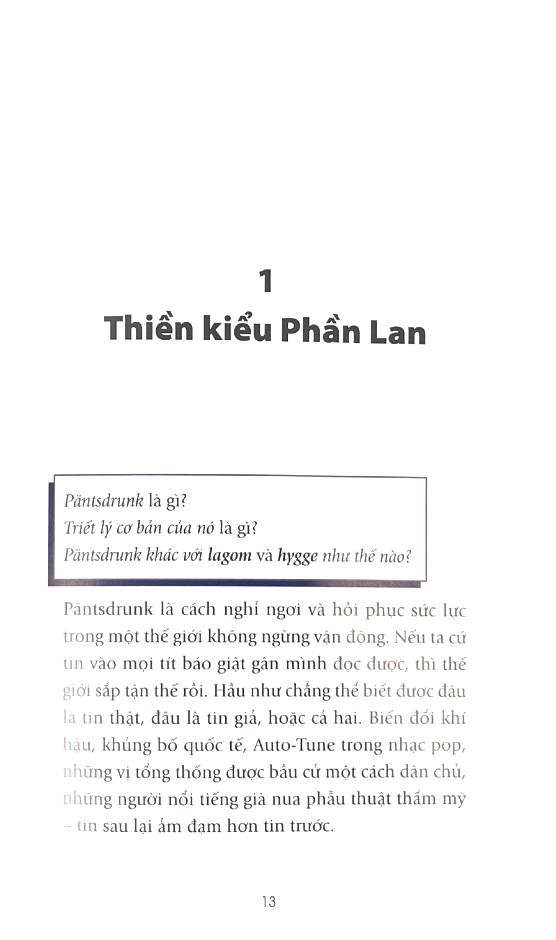 Triết Lý Sống Pantsdrunk - Chill Như Người Phần Lan Sau một tuần làm việc vất vả, hãy thoải mái dẹp hết mọi kế hoạch – và vứt luôn quần áo – rồi đóng cửa, ngồi trong nhà, bật Netflix lên và… uống đi.” - Tờ Washington Post Nói đến mức độ hạnh phúc, Phần Lan luôn đứng top thế giới. Nhiều khía cạnh đời sống ở Phần Lan là chuẩn mực ao ước của nhiều quốc gia: Hệ thống giáo dục tốt nhất, bình đẳng về giới tính, phúc lợi cao và triết lý sisu. Ẩn sau những thành tựu này chính là khả năng duy trì sự điềm tĩnh, khỏe mạnh và hài lòng giữa những cơn sóng công việc cuồn cuộn của người Phần Lan. Và khả năng này là kết quả của việc thực hành kalsarikänni, hay triết lý sống Päntsdrunk. Trong bộ đồ ngủ Mình ta với ta Tự do tự tại Uống cho quên đời
