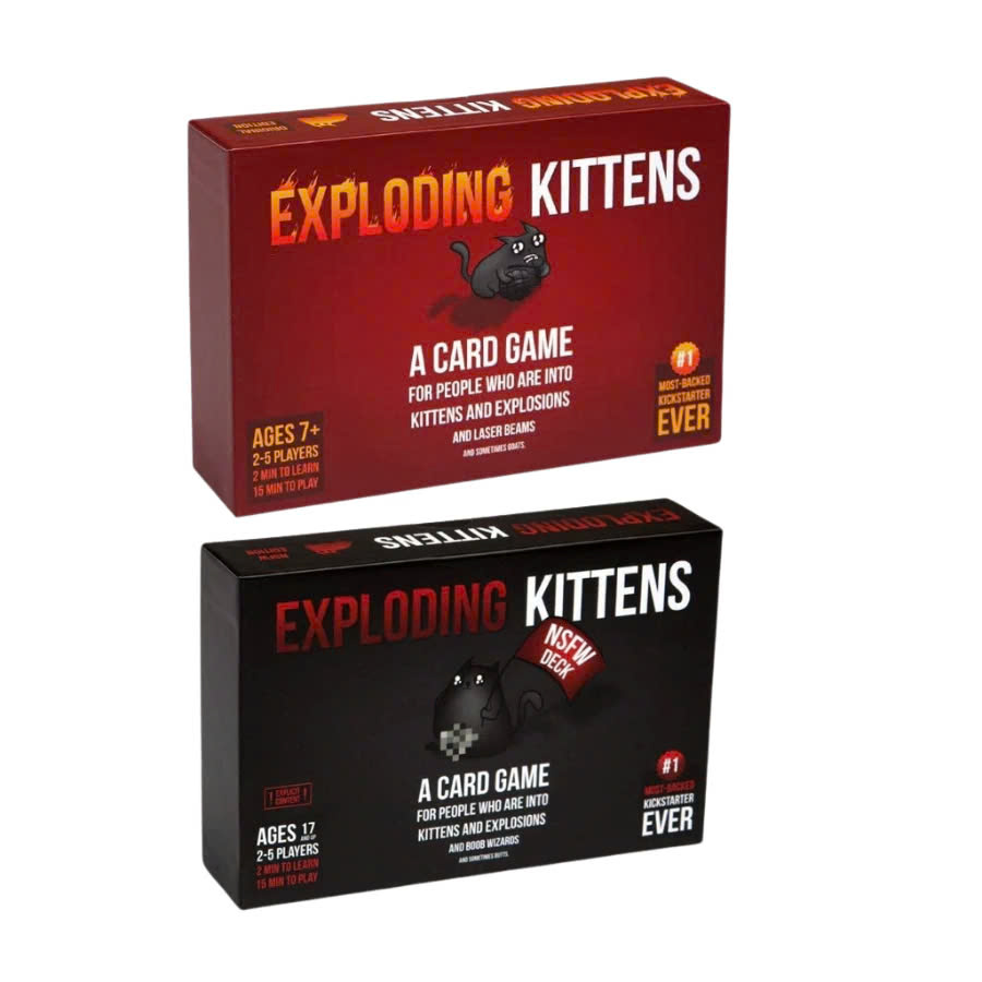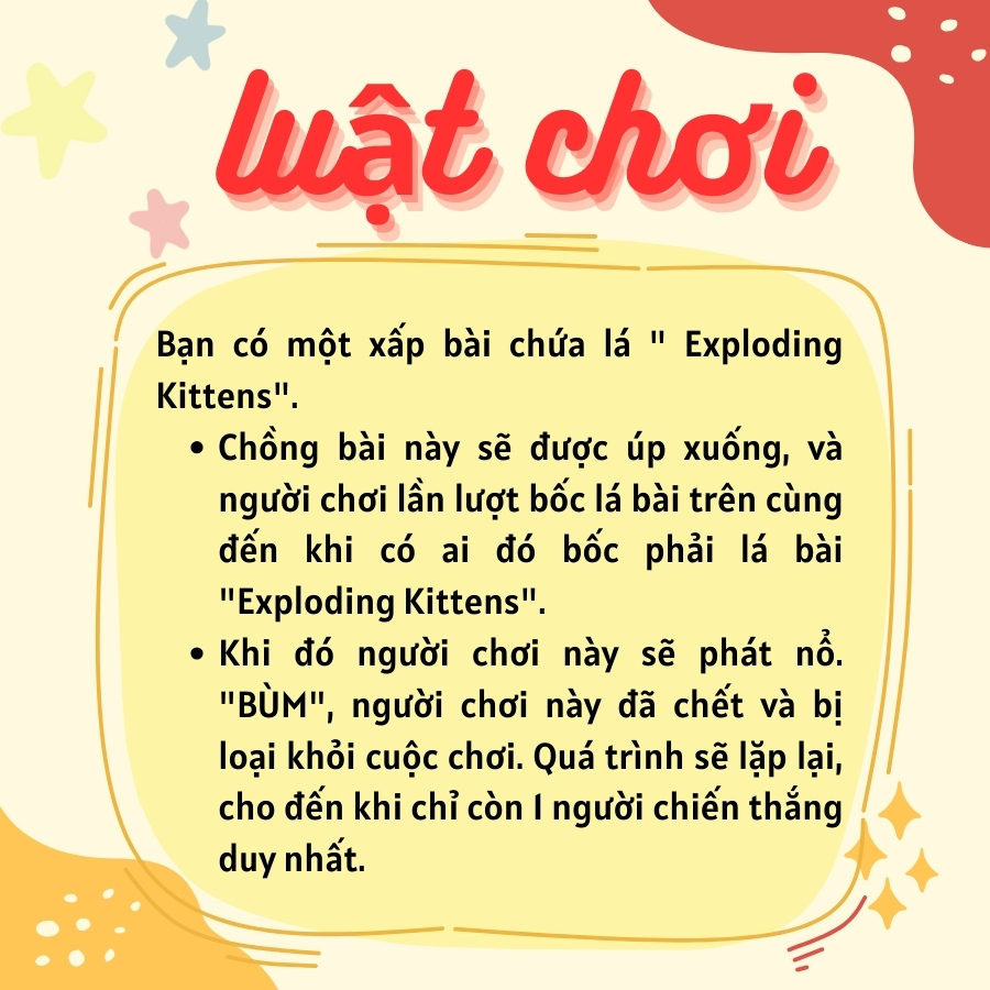 • Số người chơi: 2-5 người (nếu có bản mở rộng có thể chơi đến 9 người) CÁCH CHƠI: Bạn sẽ có một bộ bài có chứa một số lá Exploding Kittens. Cách chơi là bạn sử dụng những lá bài đặt xuống mặt bàn và thay phiên rút những lá bài trên chồng bài rút cho đến khi một người nào đó rút phải lá Exploding Kitten. Khi đó, người rút phải lá bài đó sẽ bị nổ. Họ bị chết ngay và rời khỏi game. Trò chơi tiếp tục cho đến khi chỉ còn lại một người, và người đó là người chiến thắng. SET UP ( top boardgame)