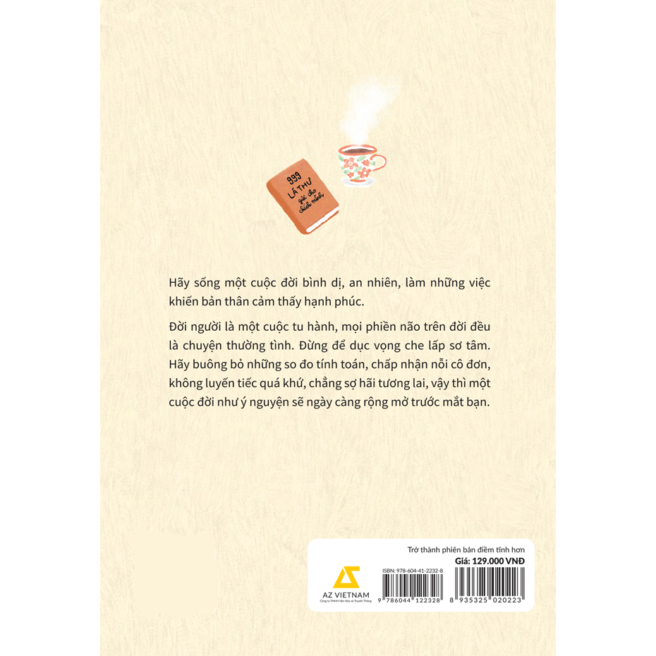 Trở Thành Phiên Bản Điềm Tĩnh Hơn Tác giả Miêu Công Tử - người đã thành công rực rỡ với cuốn sách vạn bản "999 lá thư gửi cho chính mình" – nay đã trở lại với một tác phẩm mới đầy sâu sắc mang tên: "Trở thành phiên bản điềm tĩnh hơn" Cuốn sách này đánh dấu một bước tiến mới trong sự nghiệp của tác giả, mang đến cho độc giả một nội dung hoàn toàn mới lạ nhưng vẫn giữ được phong cách gần gũi, với hơn 300 câu thiền ngữ nhắn nhủ người đọc có thể dễ dàng giác ngộ những triết lý nhân sinh. "Trở thành phiên bản điềm tĩnh hơn" không chỉ là một cuốn sách, mà còn là một hành trình tự khám phá và chữa lành sâu bên trong nội tâm của mỗi người. Thông qua từng trang sách, độc giả sẽ tìm thấy những bài học quý giá về sự bình thản nơi cõi lòng, cách sống chậm lại để cảm nhận cuộc sống một cách trọn vẹn hơn. Những lời nhắn nhủ vô cùng tinh tế và đong đầy ý nghĩa cũng sẽ giúp bạn phần nào vượt qua những lo âu, tìm lại sự cân bằng và sống một cuộc đời an lành hơn. Với tài năng và tâm huyết của mình, Miêu Công Tử tiếp tục chinh phục trái tim độc giả bằng cách dẫn dắt từng người vào một hành trình thiền tịnh - nơi mà mọi muộn phiền có thể tan biến và sự bình yên được khơi dậy từ sâu thẳm bên trong. "Trở thành phiên bản điềm tĩnh hơn" chắc chắn sẽ là một người bạn đồng hành đáng tin cậy cho những ai đang tìm kiếm sự an yên trong tâm hồn và sự sáng suốt trong cuộc sống này.