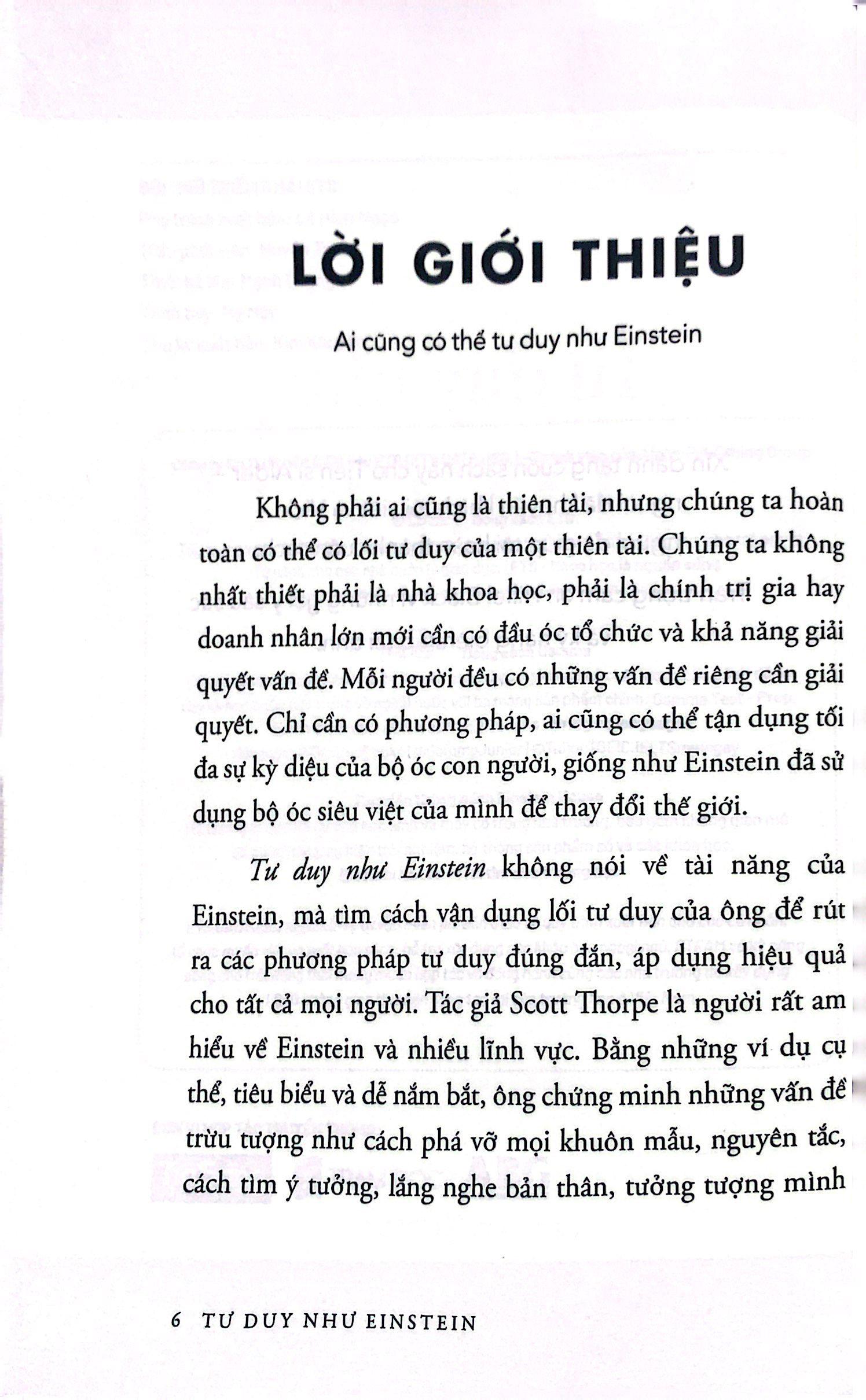 Tư duy như Einstein – cuốn sách phát triển tư duy mở ra những giải pháp đột phá để đối mặt, giải quyết mọi thách thức trong học tập, công việc, cuộc sống, các mối quan hệ, để không ngừng sáng tạo và phát triển mỗi ngày. Không phải ai cũng là thiên tài, nhưng chúng ta hoàn toàn có thể có lối tư duy của một thiên tài. Chúng ta không nhất thiết phải là nhà khoa học, không nhất thiết phải là chính trị gia hay doanh nhân lớn mới cần có đầu óc tổ chức và khả năng giải quyết vấn đề. Mỗi người đều có những vấn đề riêng cần giải quyết. Chỉ cần có phương pháp, ai cũng có thể tận dụng tối đa sự kỳ diệu của bộ óc con người, giống như Einstein đã sử dụng bộ óc siêu việt của mình để thay đổi thế giới. Và cuốn sách Tư duy như Einstein sẽ giúp bạn làm được điều đó. Tư duy như Einstein không nói về tài năng của Einstein, mà tìm cách vận dụng những lối tư duy của ông để rút ra các phương pháp tư duy đúng đắn và hiệu quả cho tất cả mọi người. Tác giả Scott Thorpe tỏ ra là người rất am hiểu về Einstein và nhiều lĩnh vực. Bằng những ví dụ cụ thể, tiêu biểu và dễ nắm bắt, ông chứng minh những vấn đề trừu tượng như cách phá vỡ mọi khuôn mẫu, nguyên tắc, tìm ý tưởng, lắng nghe bản thân, tưởng tượng mình là người khác hay sử dụng những ký hiệu, ngôn từ mới để thể hiện ý tưởng. Cuốn sách gồm 11 chương và hai phụ lục, hai chương đầu giới thiệu khái quát về Einstein và cách tư duy của ông, các chương tiếp theo đưa ra những bước đơn giản nhằm “phá vỡ nguyên tắc và khám phá khả năng thiên tài tiềm ẩn trong bạn”. Mỗi chương là một bước khám phá thông qua nhiều phương pháp và những ví dụ từ kinh điển đến thực tế giản đơn. Tư duy như Einstein là một câu chuyện, trong đó tác giả dẫn người đọc đi qua từng chặng đường với những bài thực hành độc đáo, giản dị đến mức khó tin, nhưng lại phản ánh cả một triết lý sâu sắc. Với rất nhiều loại công cụ đơn giản, bạn có thể thực hành các bài tập, nhưng quan trọng nhất vẫn là biết vận dụng chúng vào thực tế cuộc sống. Hãy nghĩ đến kết quả trước khi hành động, suy nghĩ tích cực, loại bỏ khó khăn và cản trở đến từ chính bản thân mình, thực thi những giải pháp tưởng như bất khả thi. Học cách tư duy của Einstein chính là học cách phá vỡ các nguyên tắc. Tác giả đã chứng minh rằng mọi nguyên tắc đều có thể bị phá vỡ và mục đích của việc phá vỡ nguyên tắc là để tìm ra giải pháp tối ưu. Tuy nhiên, không phải tất cả những cái mới đều hay và phù hợp, có những điều chúng ta không nên thay đổi. Từ cổ chí kim, mọi cuộc cách mạng, mọi sự thay đổi đều gian nan. Thế giới thực tại thường vận hành không như ý muốn của con người. Các sáng kiến có thể gây nguy hiểm cho người nghĩ ra chúng vì lòng tham, sự ích kỷ hoặc vì lối mòn tư duy của con người. Do đó, để có được cái mới, cái hay và cái đúng, chúng ta không những cần có phương pháp mà còn phải tỉnh táo, khéo léo để vượt qua và tránh những tai họa mà những người sáng tạo thường gặp phải. Chương 9 dành tặng độc giả những bài học tránh tai họa để thẳng tiến trên con đường phá vỡ nguyên tắc của mình. Tất cả mọi thứ đều có thể đưa đến giải pháp, hãy chú ý quan sát và lắng nghe, thậm chí lắng nghe cả kẻ thù của bạn. Đó không phải là một phép màu hay một truyện cổ tích, đó đơn giản là một phương pháp tư duy và giải quyết vấn đề.