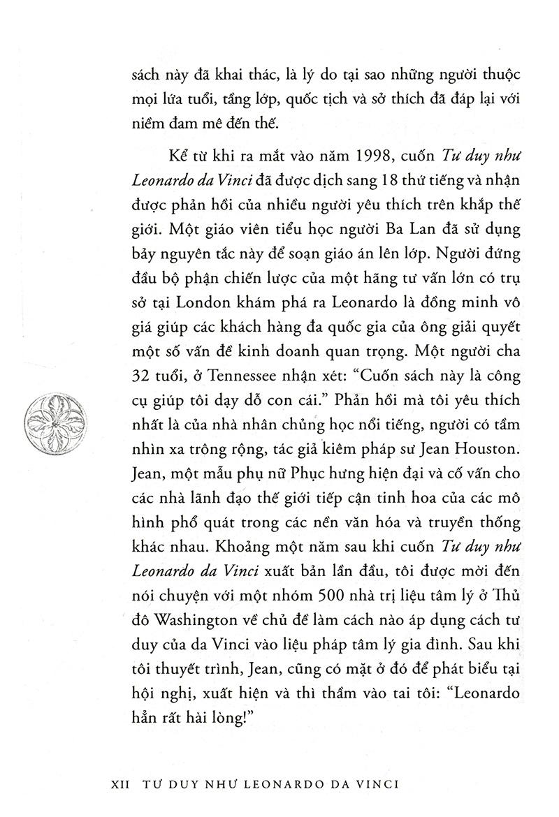 Tư duy như Leonardo da Vinci là cuốn sách kỹ năng giúp bạn có thể khám phá khả năng tiềm ẩn của m.ình, mài sắc nó và giải phóng trí thông minh bằng cách thực hiện theo những cách mà thiên tài lớn nhất mọi thời đại Leonardo da Vinci đã làm.